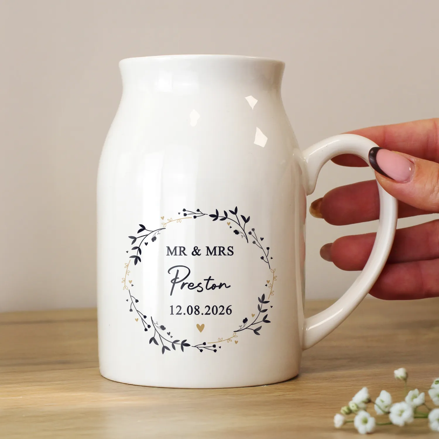Stylish, versatile, and uniquely personalised, this Wreath Design Ceramic Flower Jug Vase is a beautiful way to celebrate life’s special moments while adding charm to any home.