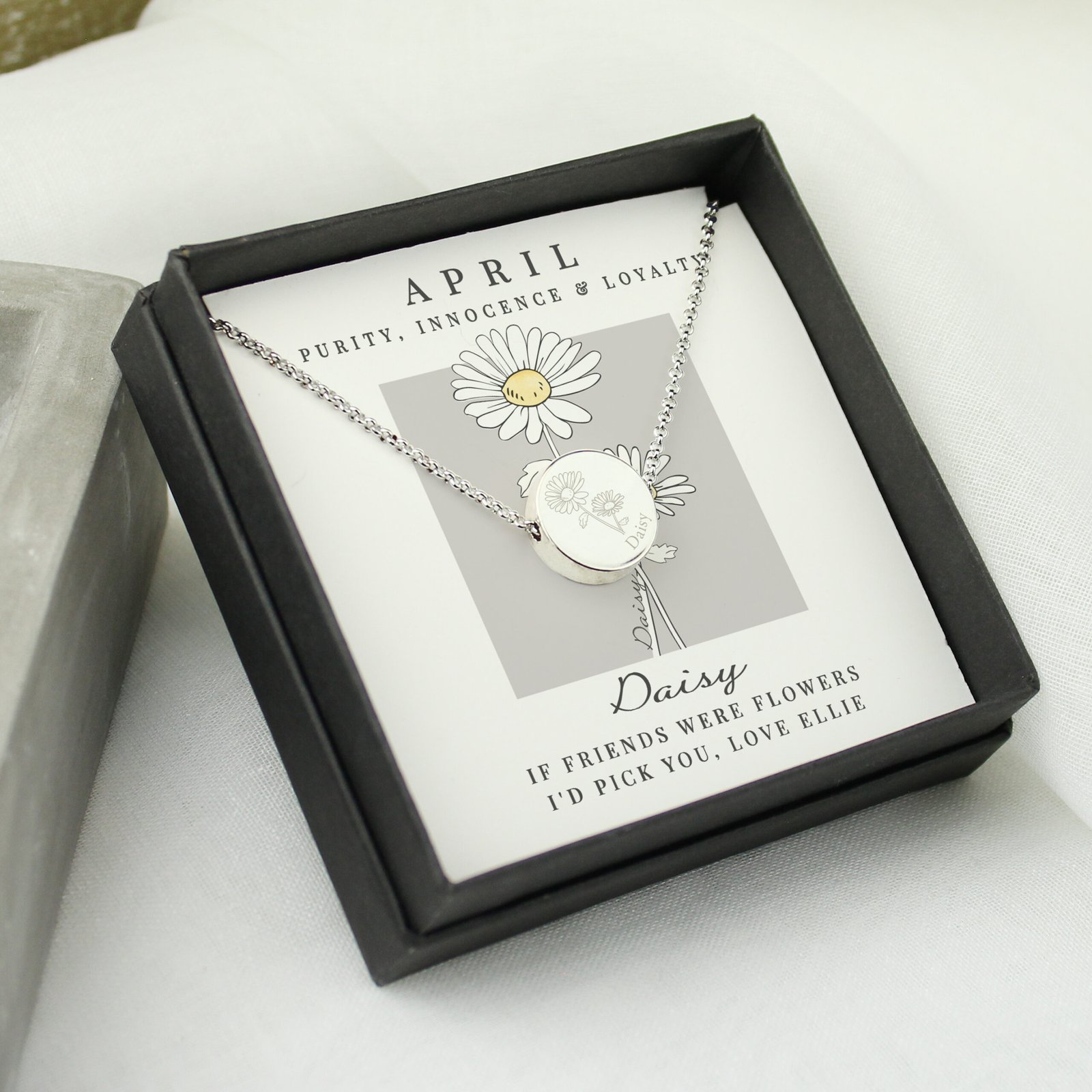 Celebrate the beauty of April with this elegant birth flower disc necklace and gift box set, featuring a delicate daisy design symbolising purity, innocence & loyalty. A thoughtful and timeless gift for any special occasion.