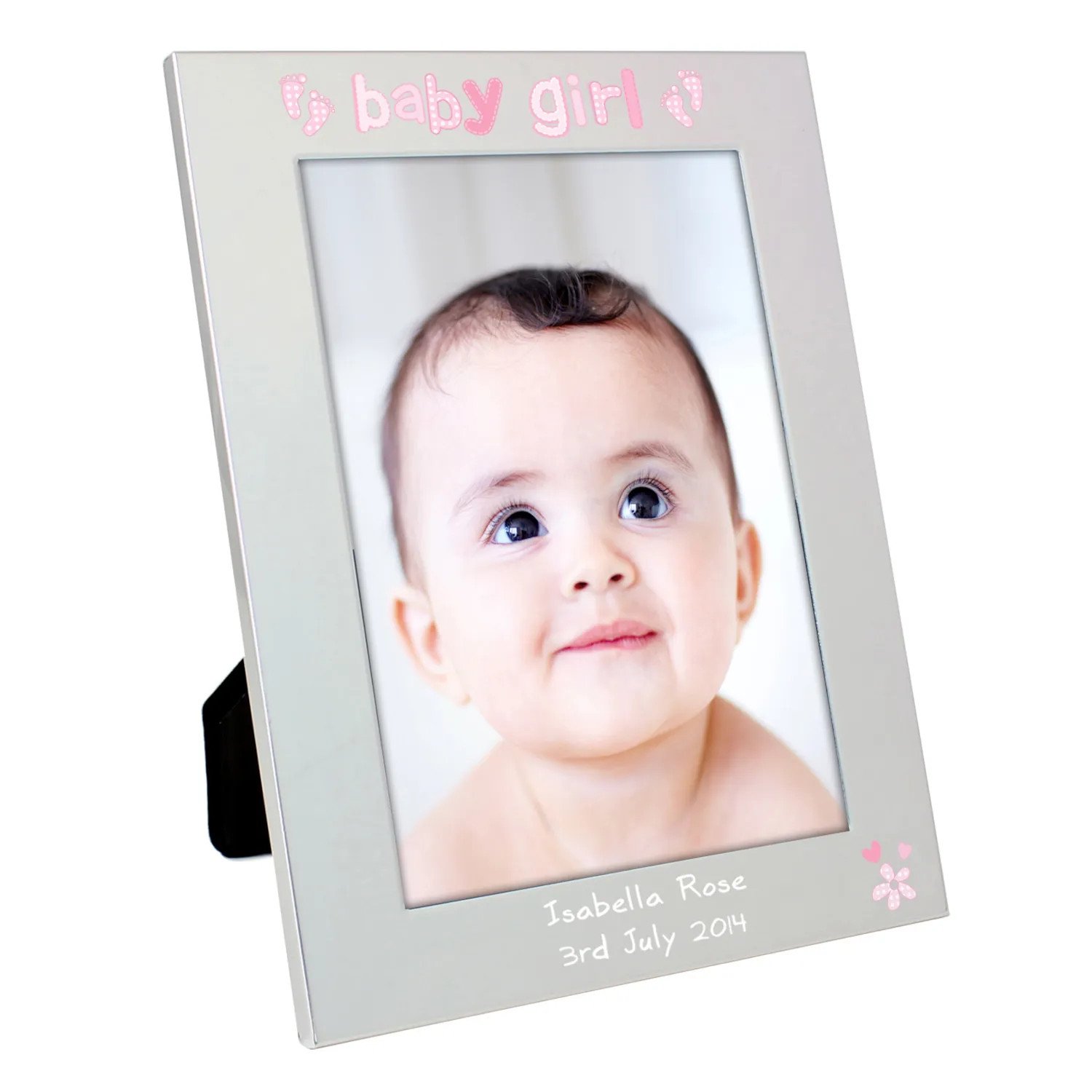 Personalised ‘Baby Girl’ Footprints Motif 5×7 Portrait Silver Aluminium Photo Frame