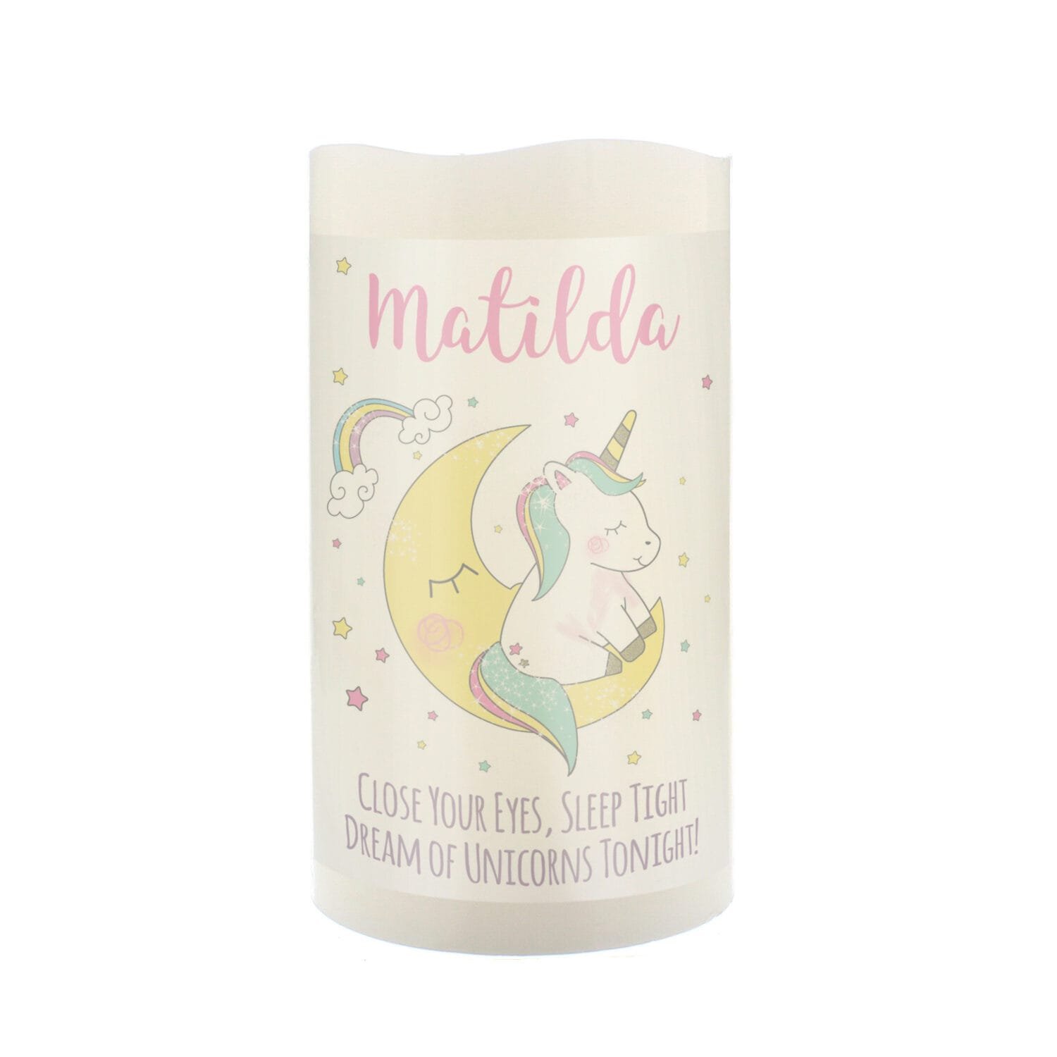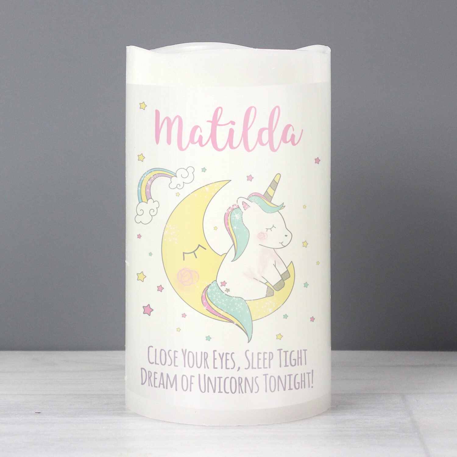 Bring a comforting glow and a hint of magic to bedtime with this personalised unicorn LED candle — a practical and precious keepsake for little ones.