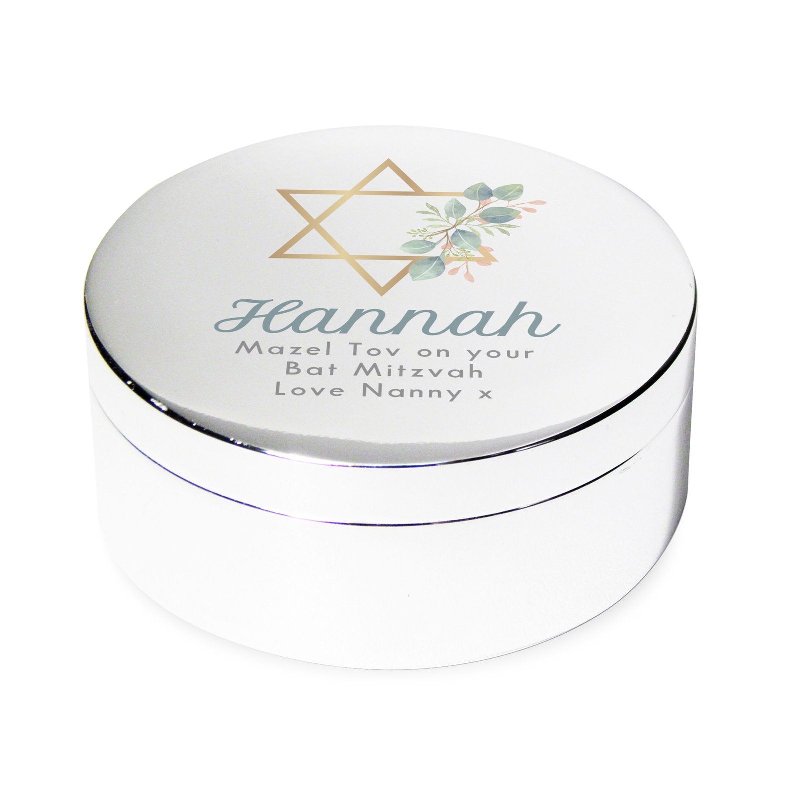 Commemorate this once-in-a-lifetime occasion with the Personalised Bat Mitzvah Round Silver Nickel Plated Trinket Box — a stunning keepsake that captures the beauty and meaning of this special day. ✡️