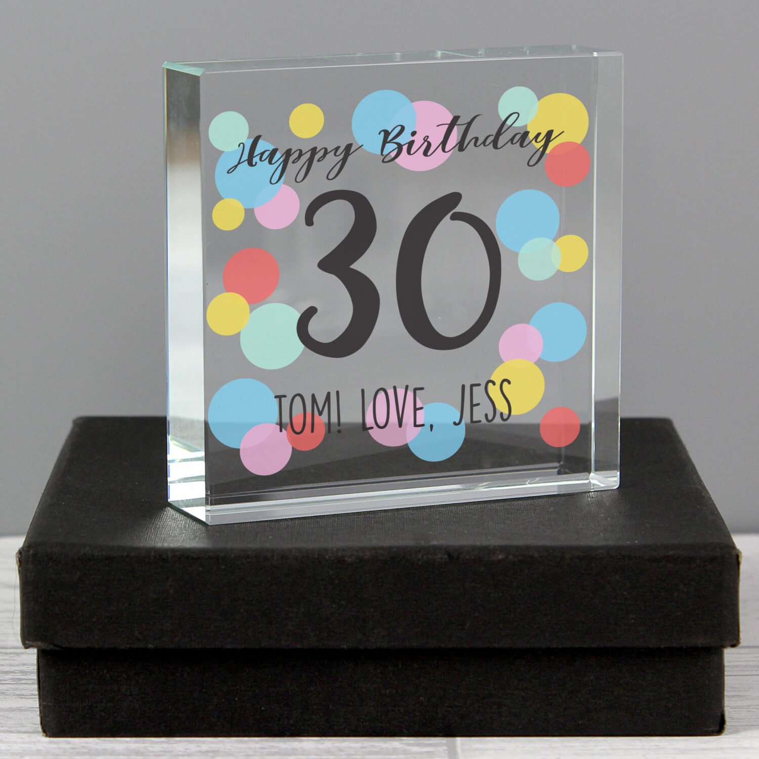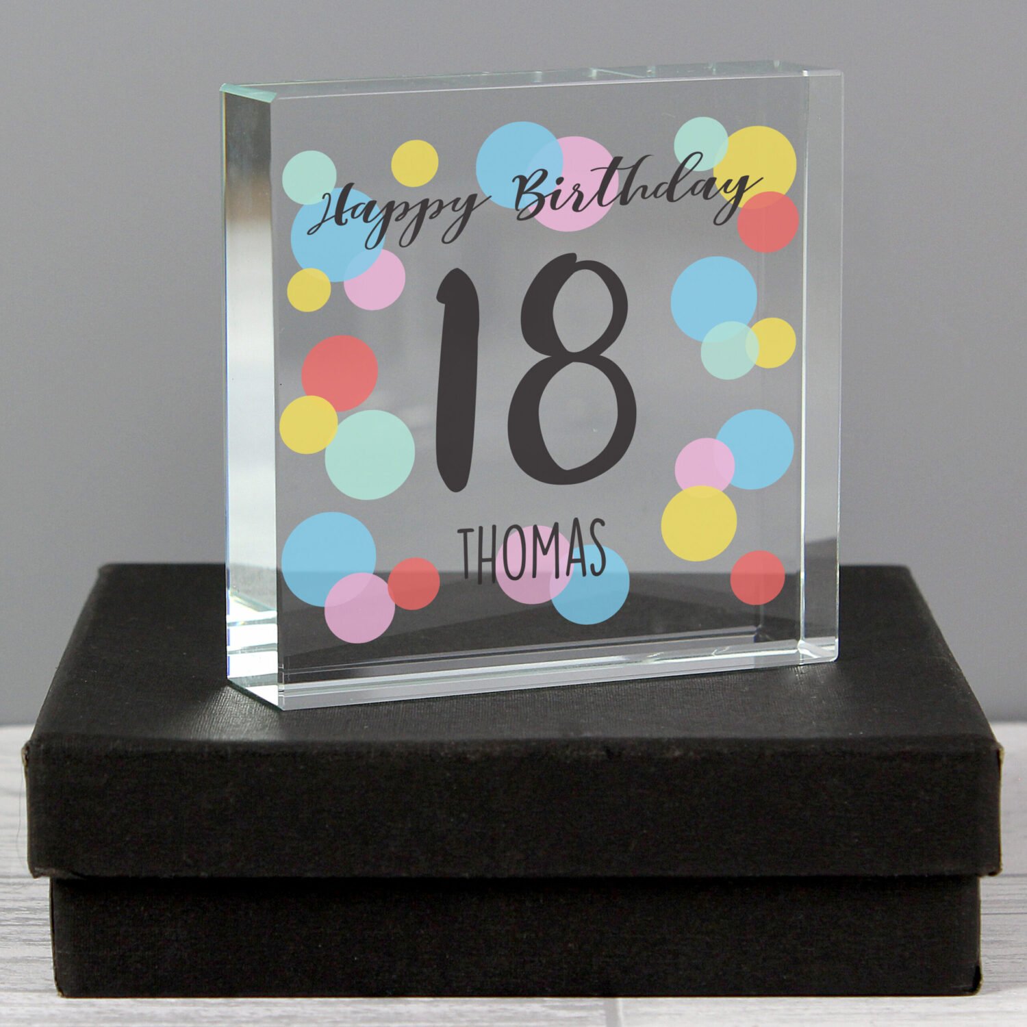 Celebrate a special birthday milestone in vibrant style with this Personalised Colour Confetti Design Crystal Glass Token. With its cheerful design and personalised details, this charming keepsake makes a heartfelt gift for any age – beautifully presented and ready to display.