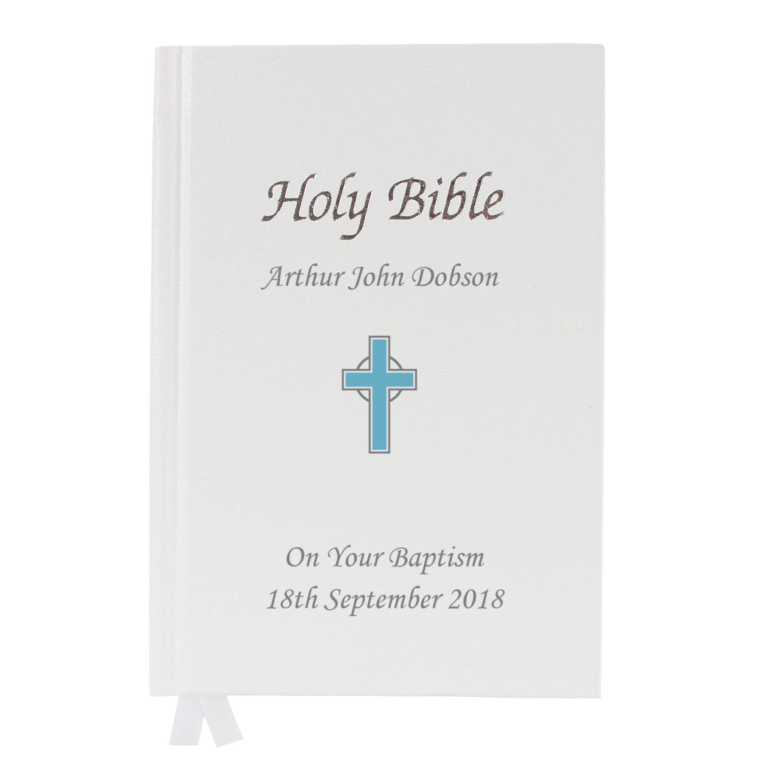 Mark a special religious milestone with this beautiful Personalised Blue Cross Motif Holy Bible. Thoughtfully designed with a delicate cross motif, this elegant Bible makes a meaningful keepsake for a young boy celebrating a Christening, Baptism, Holy Communion, or Confirmation.