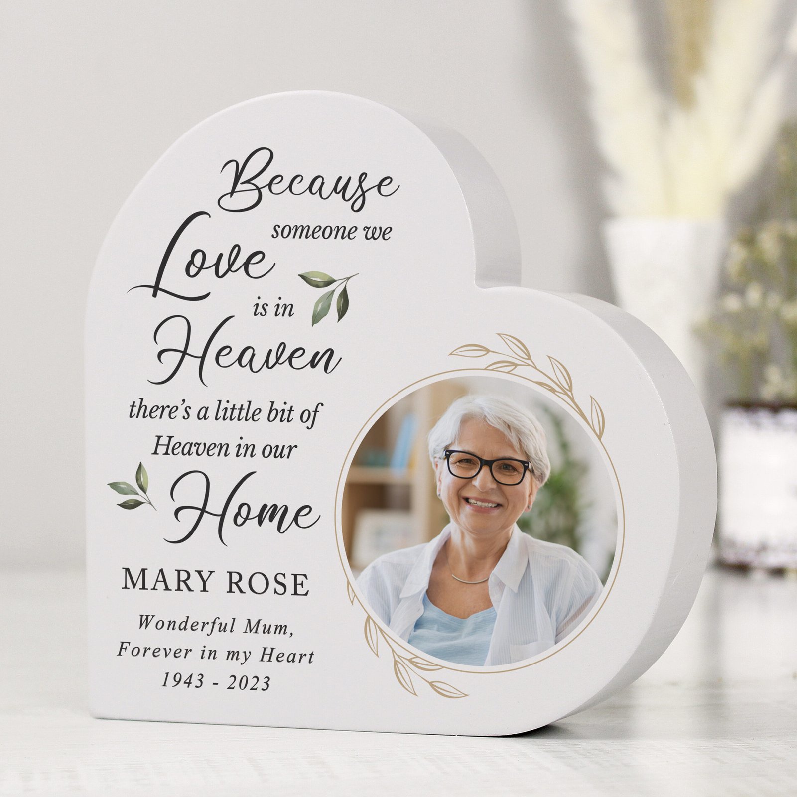 A touching way to honour the memory of a loved one, this free-standing grey wooden heart ornament combines a treasured photo with a heartfelt sentiment. Its botanical design adds elegance, making it a meaningful keepsake for display in any home.
