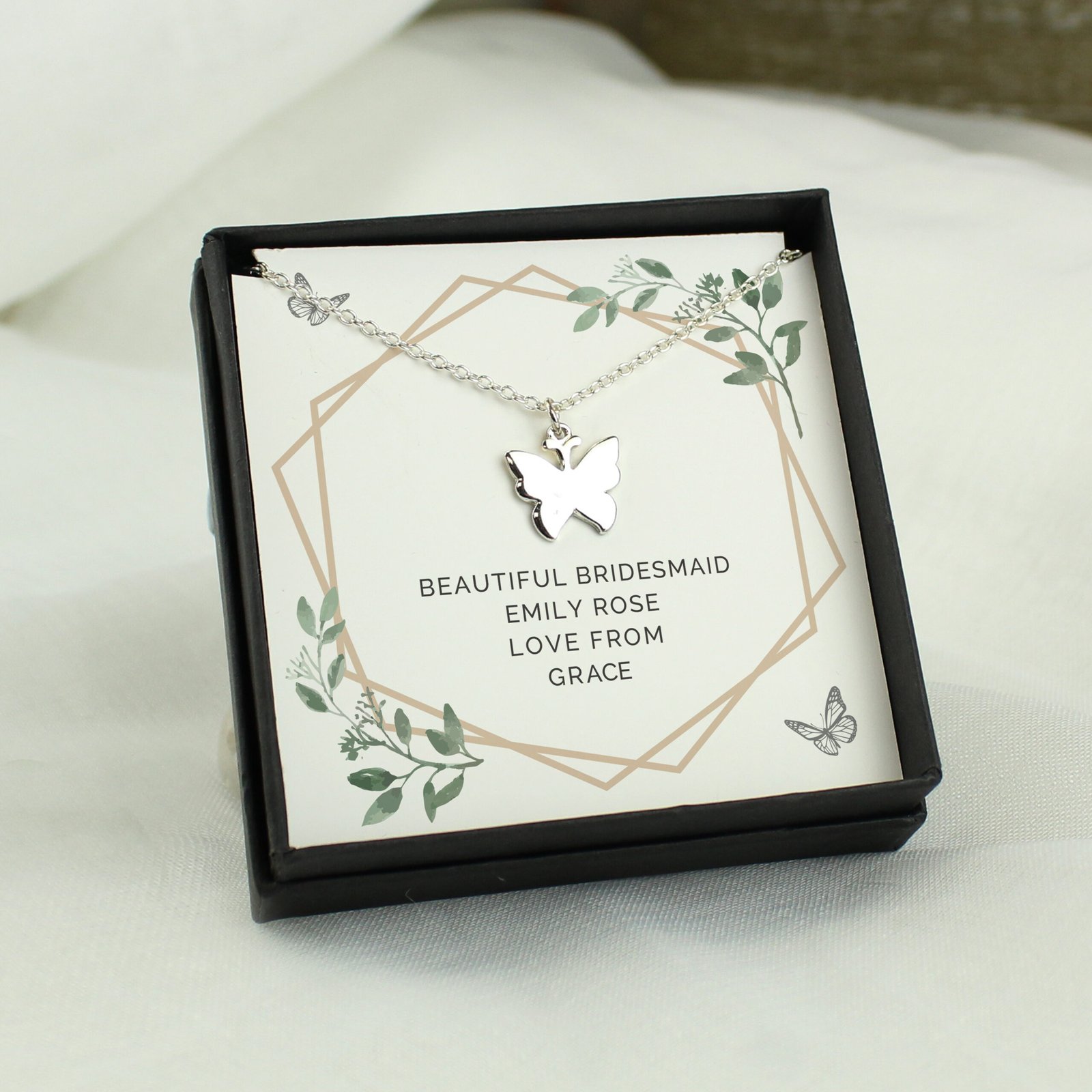 Personalised Botanical Design Sentiment Silver Plated Butterfly Necklace & Gift Box