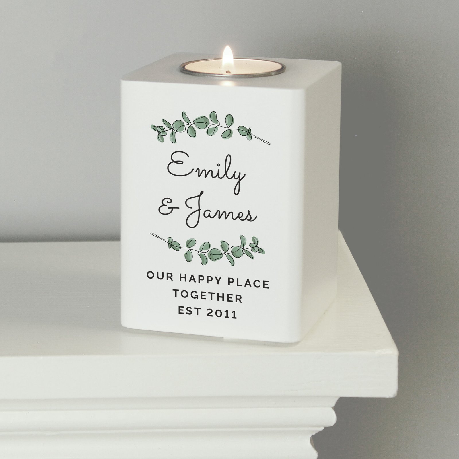 Personalised Botanical Design White Wooden Tea Light Candle Holder
