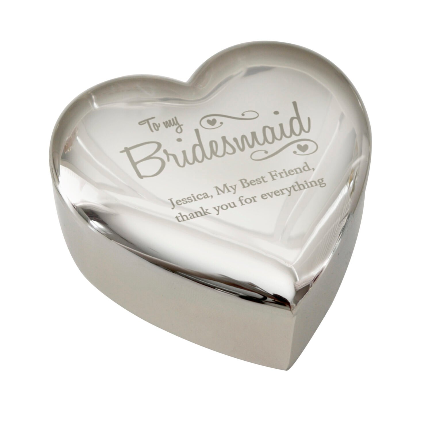 Personalised ‘Bridesmaid’ Swirls & Hearts Design Heart Shaped Silver Nickel Plated Trinket Box
