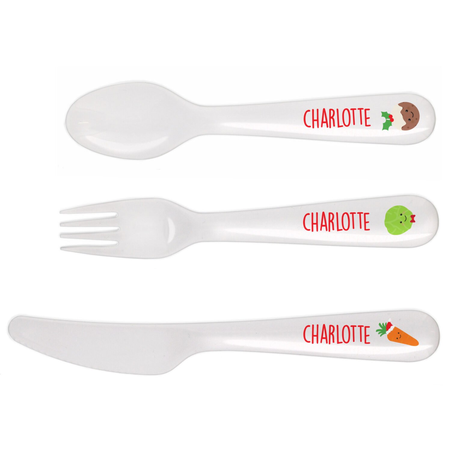 - Festive Character Design: Features a playful Christmas sprout motif, with a carrot on the fork and a happy Christmas pudding on the knife, adding festive fun to every meal.