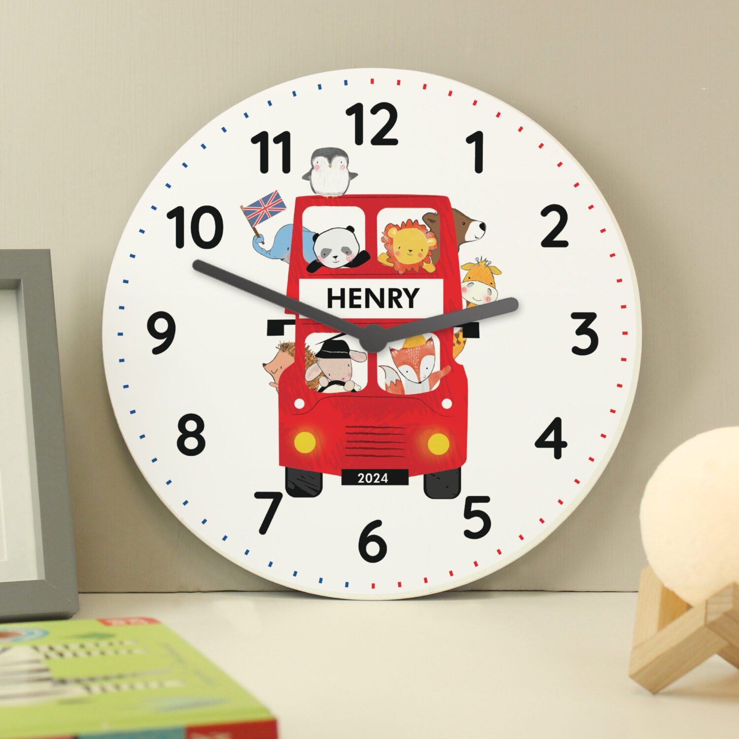 Personalised Children’s London Bus & Animals Design Round Wooden Wall Clock
