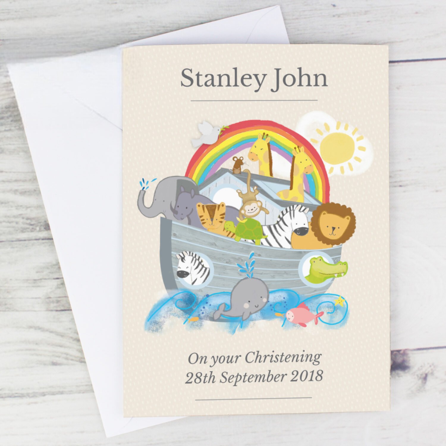 Celebrate a precious new arrival or a special christening with this adorable Noah’s Ark themed personalised greeting card. Featuring a charming design, it’s a heartfelt keepsake that will be treasured for years to come.