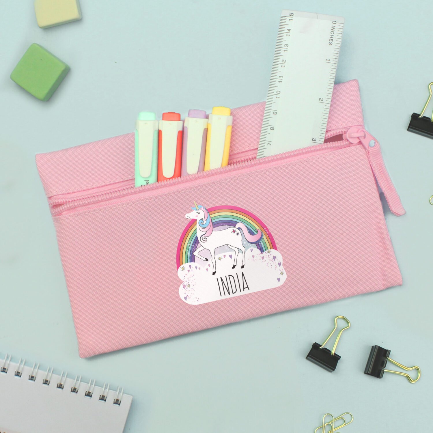 Personalised Children’s Rainbow Unicorn Design Pink Pencil Case