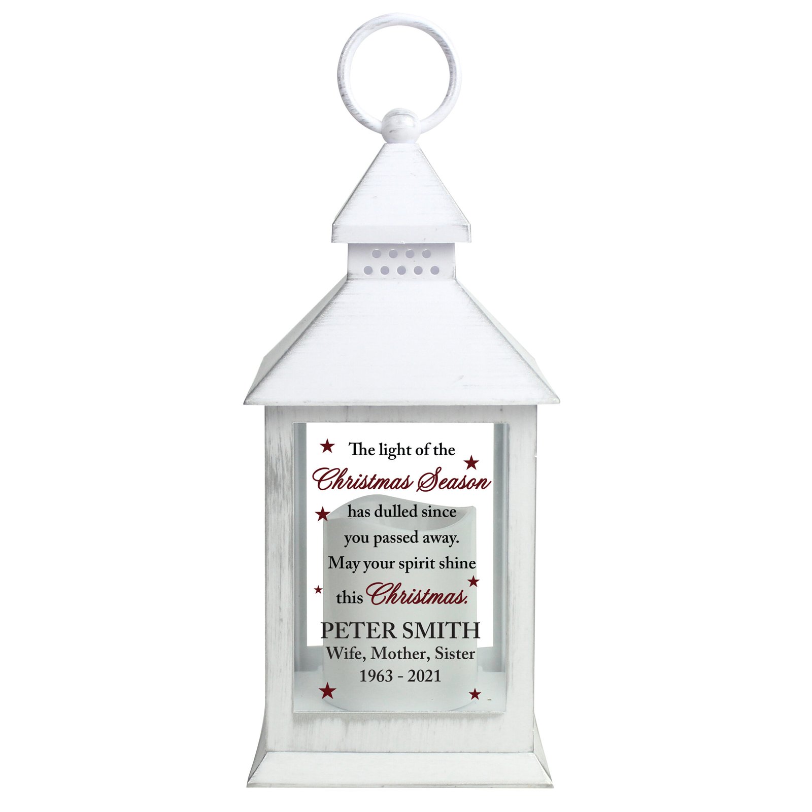 Keep the memory of a loved one shining bright during the festive season with this beautifully crafted memorial lantern. Designed with a rustic white finish and a warm flickering glow, it’s a heartfelt way to bring comfort and remembrance at Christmas.