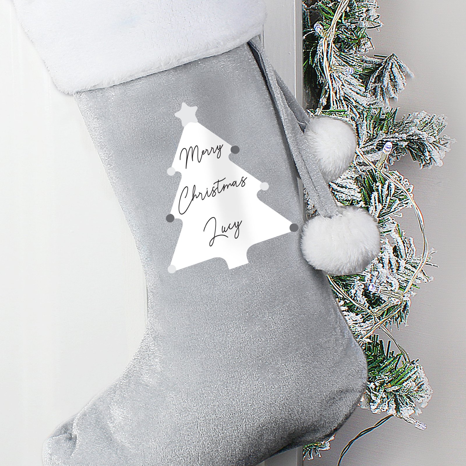 Personalised Christmas Tree Design ‘Merry Christmas’ Luxury Grey Pom Pom Christmas Stocking