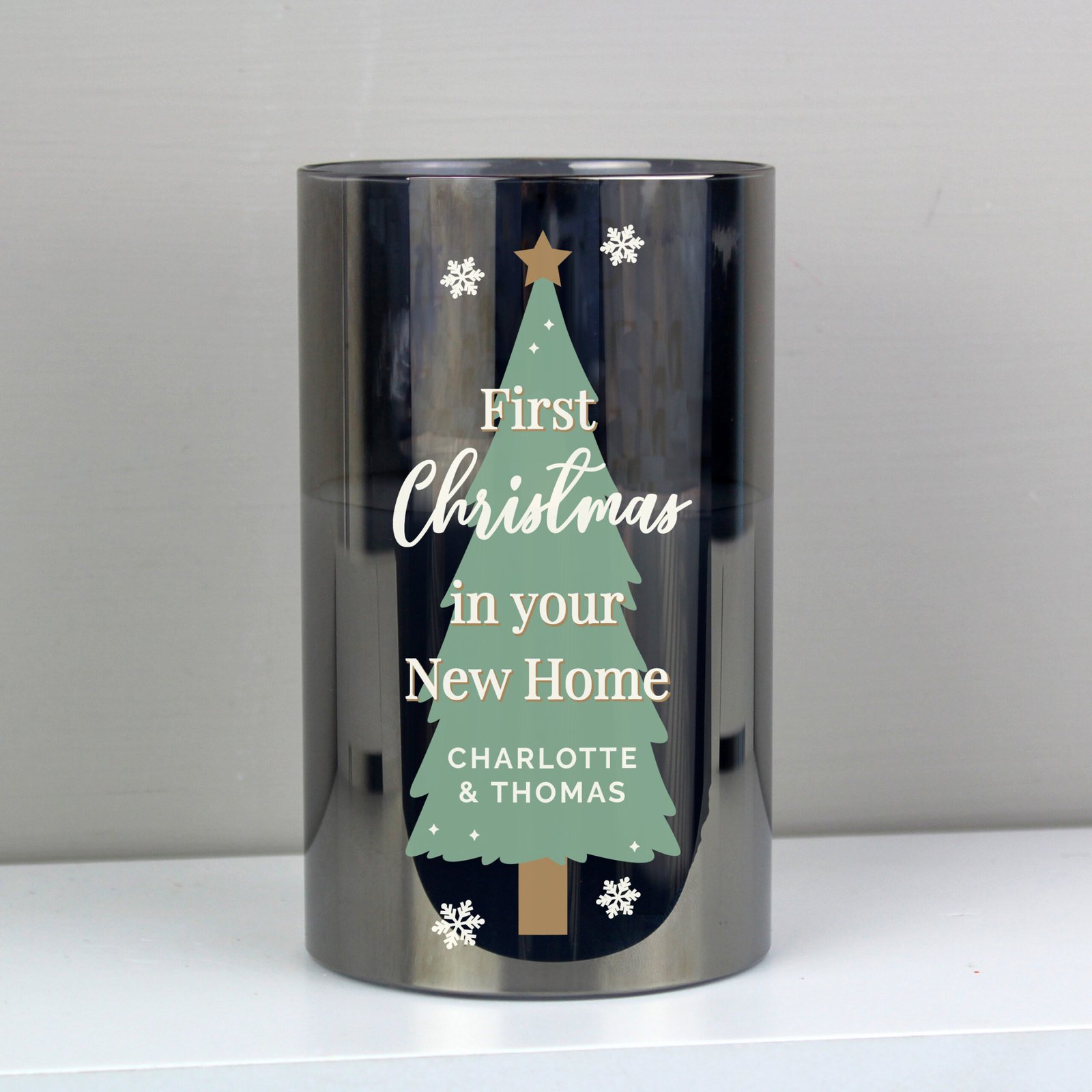 Bring festive charm and a touch of luxury into your home with this personalised smoked glass LED Christmas candle – a keepsake that will light up every Christmas.