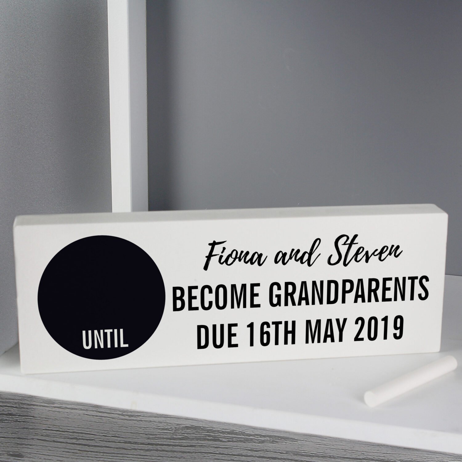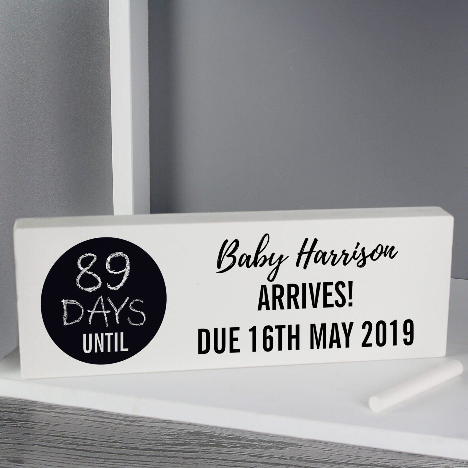 - Chalkboard Countdown Area: Write the number of days, weeks, or months remaining on the chalkboard-style panel.