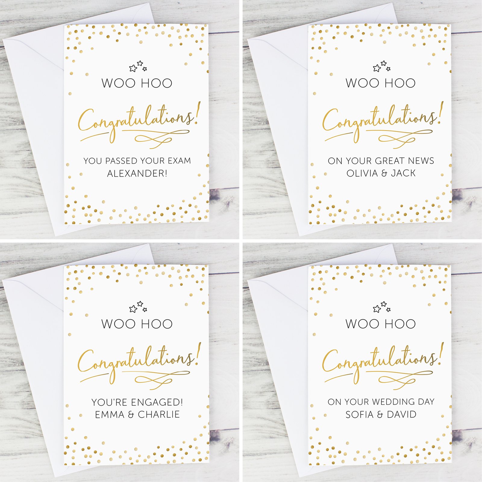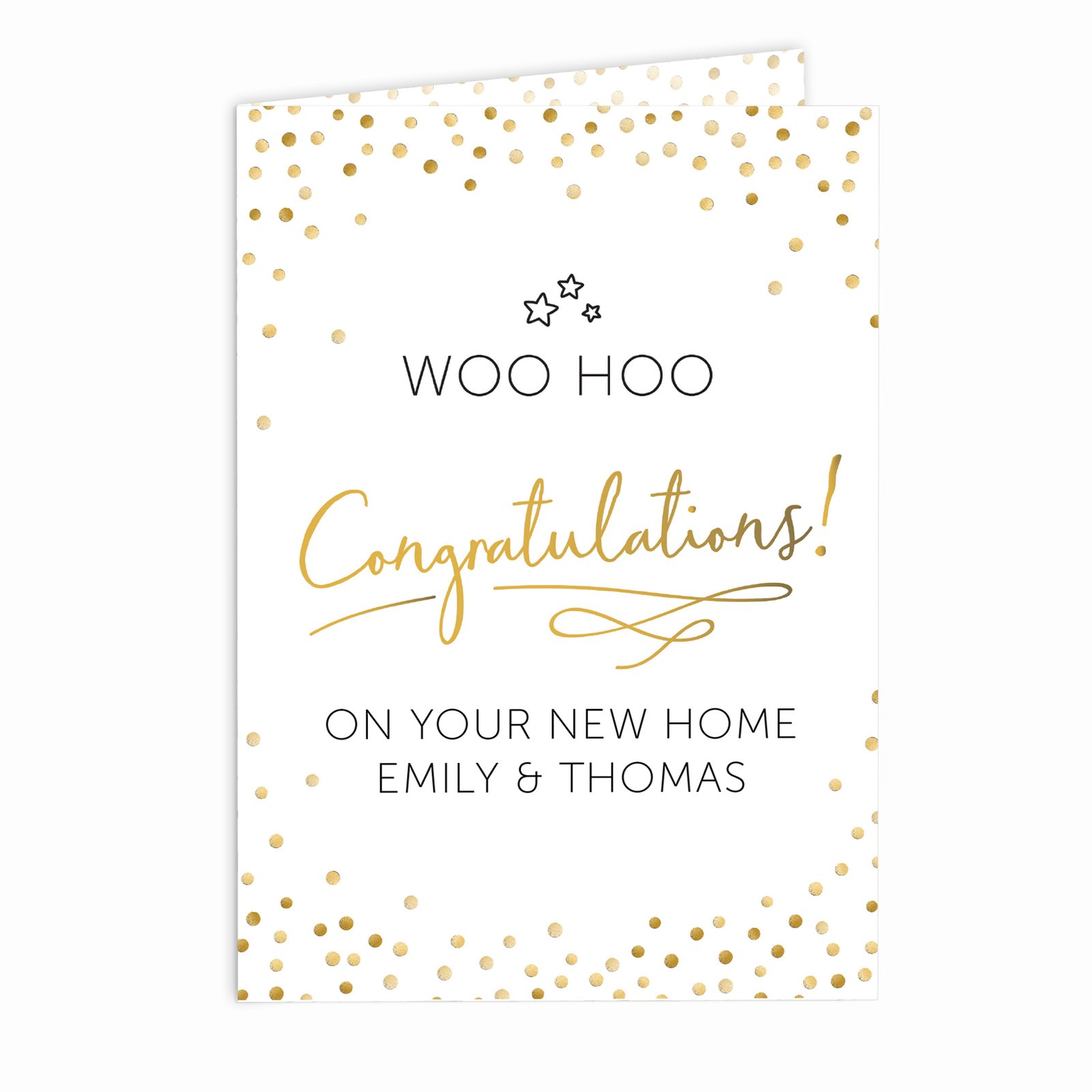 🌟 Bold & Modern Design: Features sparkling gold confetti and star icon accents, along with fixed celebratory phrases: ‘Woo Hoo’ and ‘Congratulations!’.