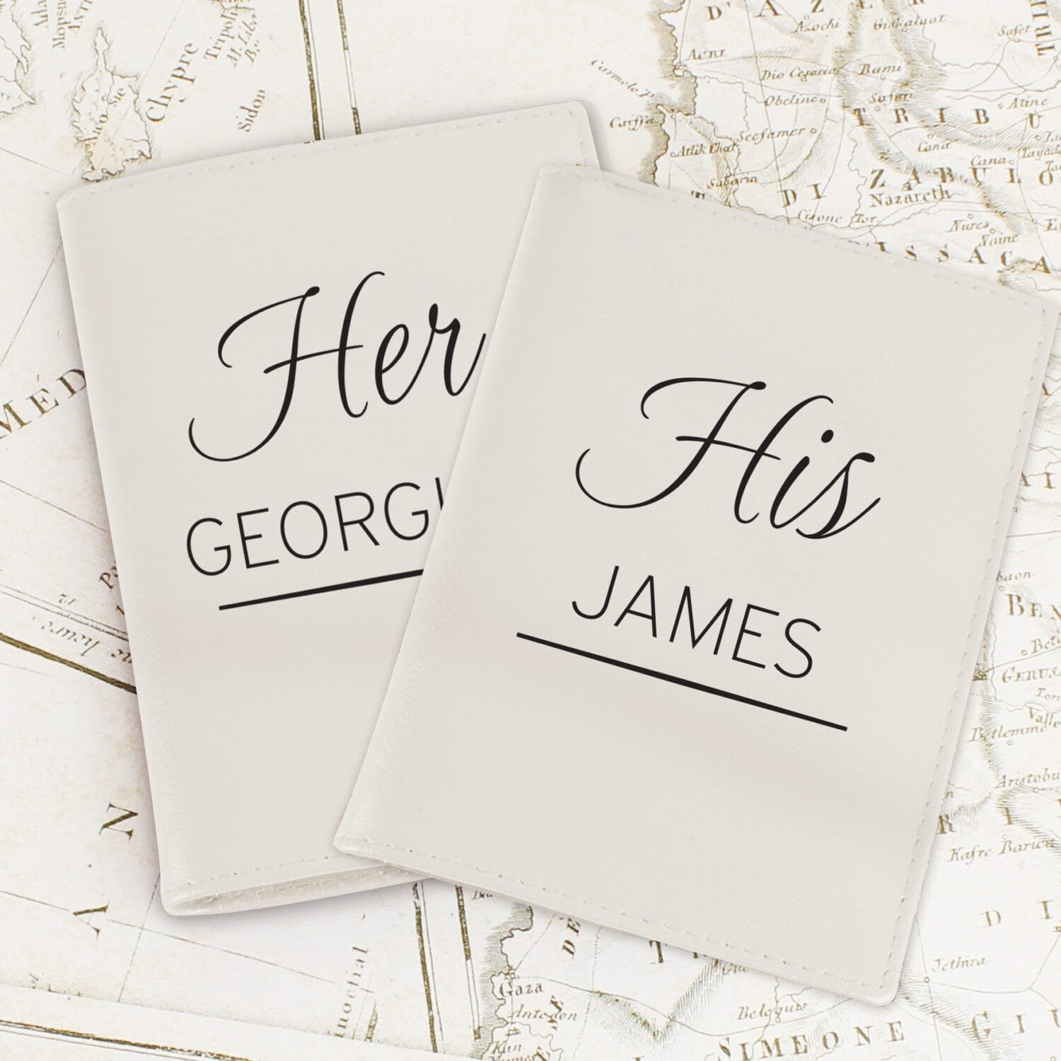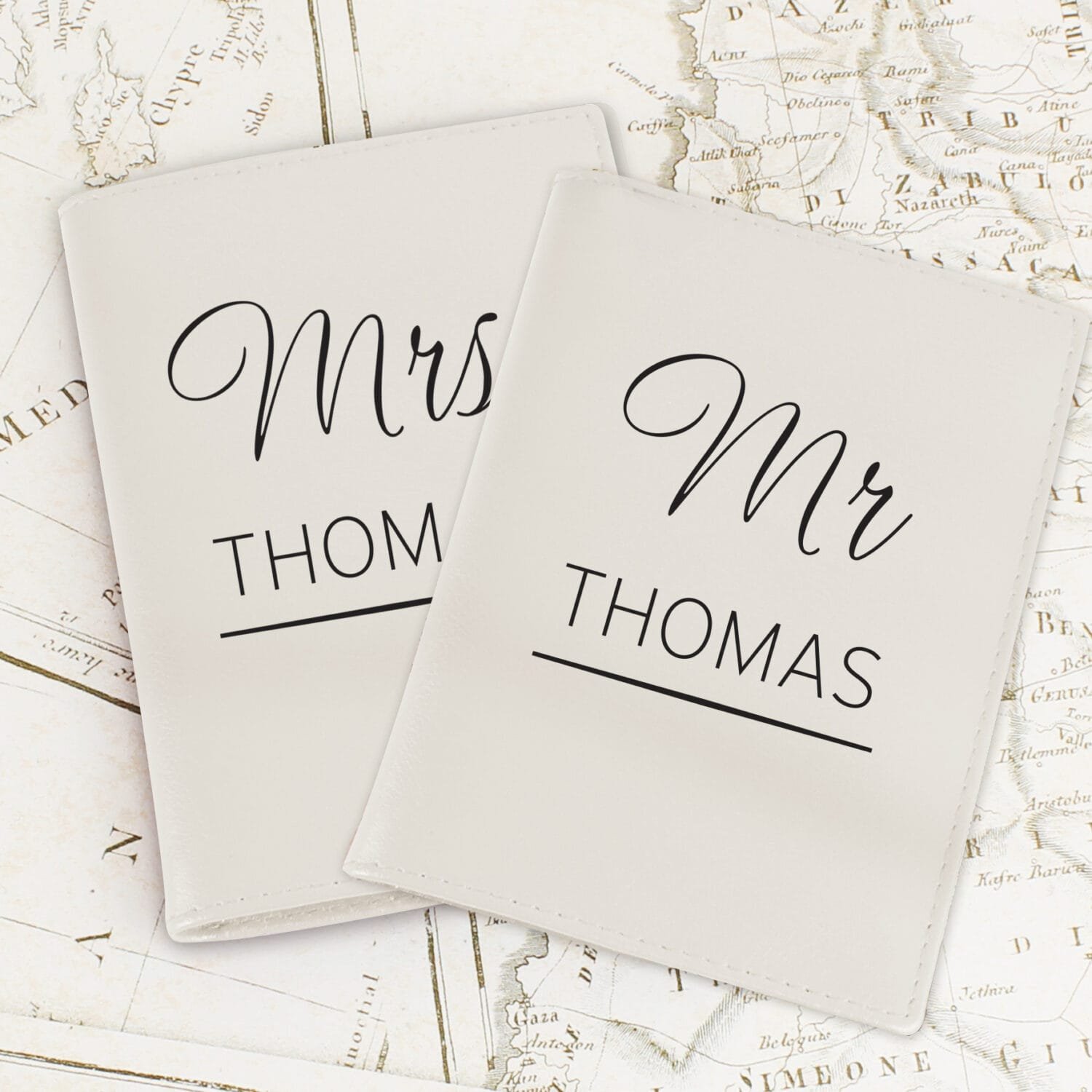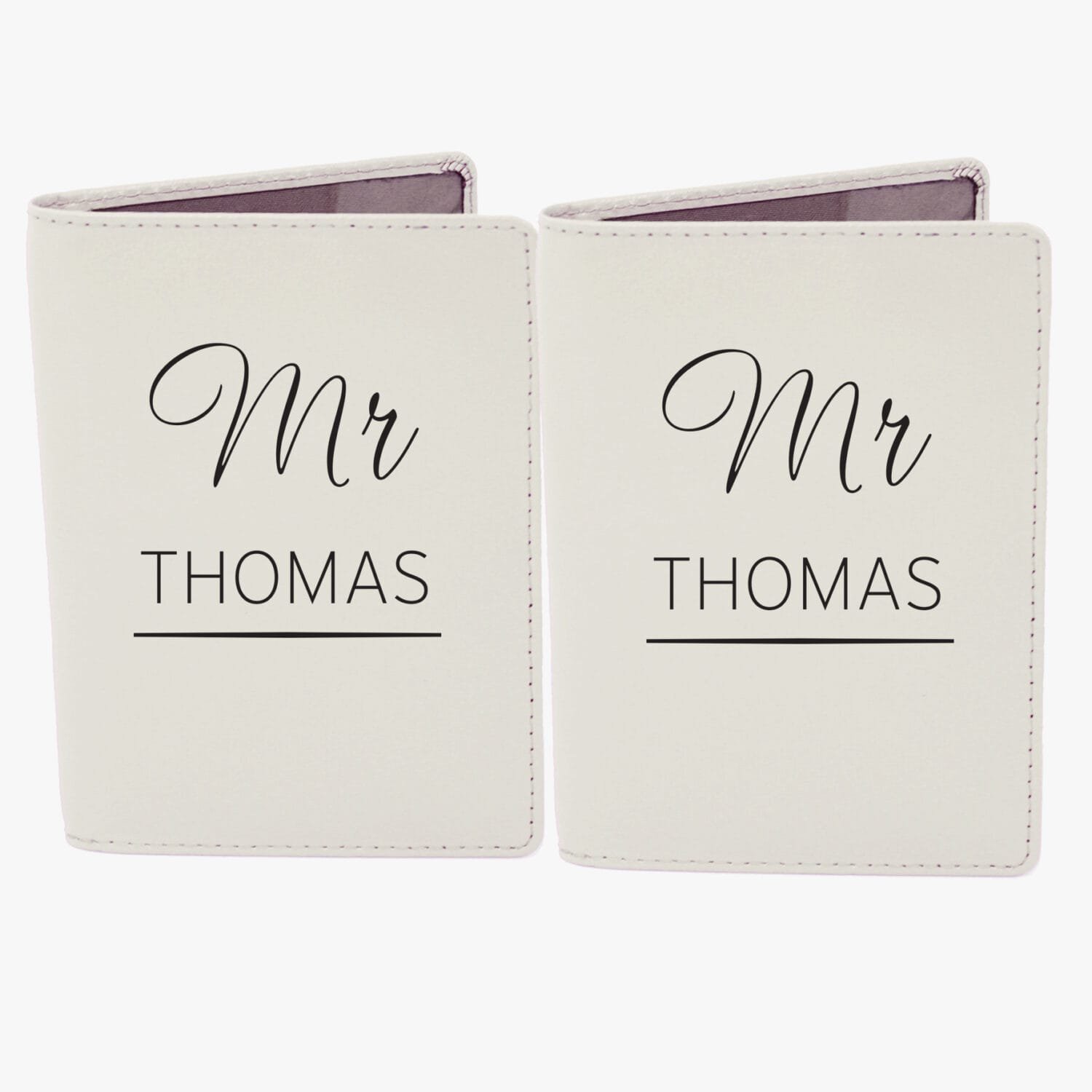 Line 2 (Surname): Automatically formatted in UPPERCASE for a bold finish. - Set Includes Two Holders: Supplied as a pair of cream passport holders, perfect for couples travelling together.