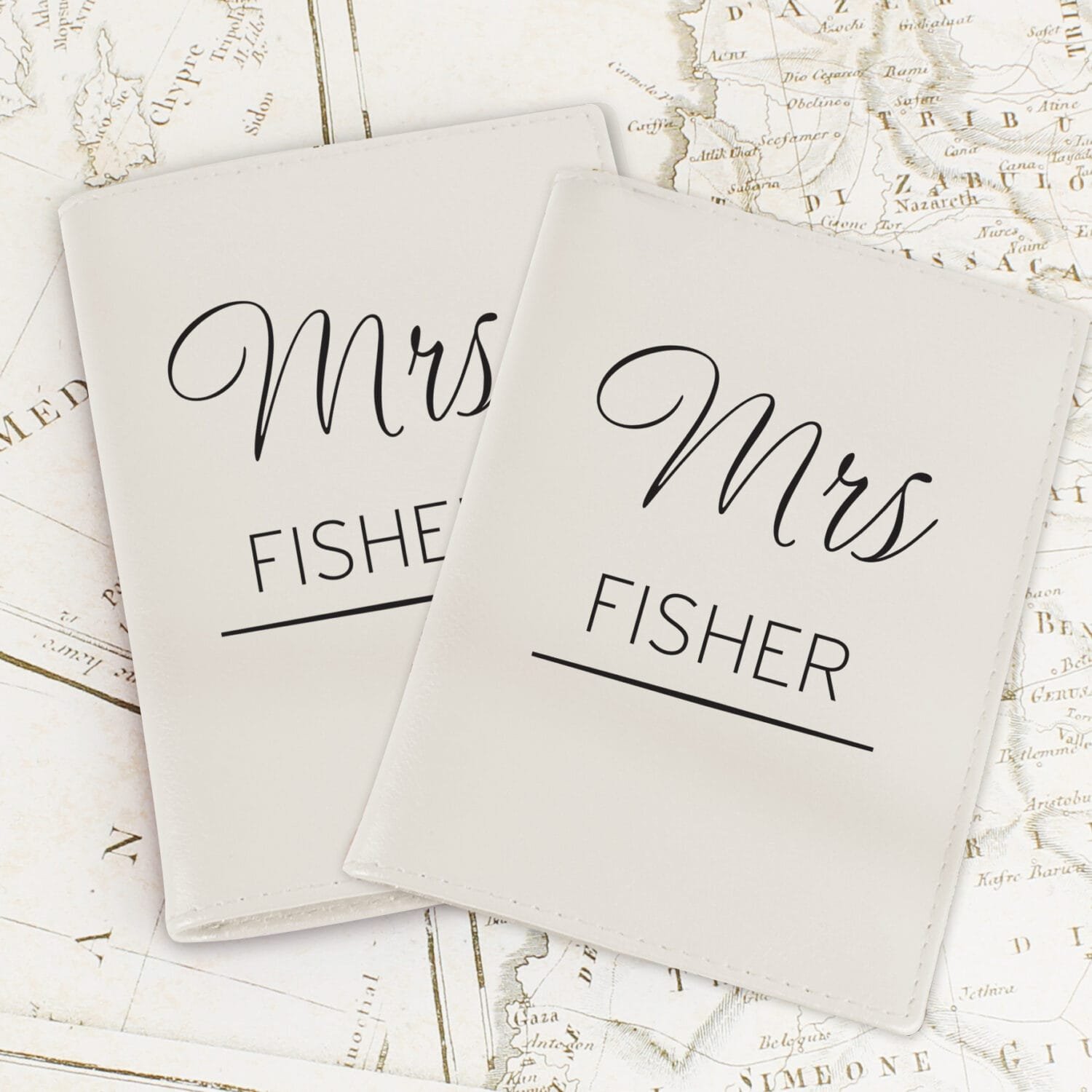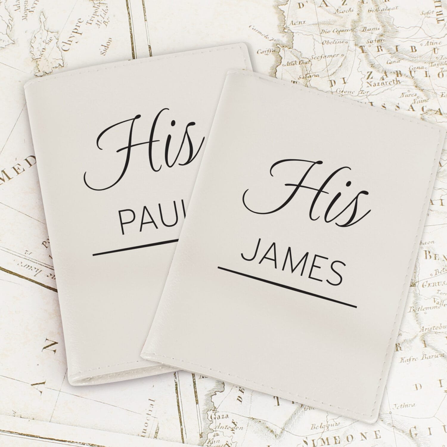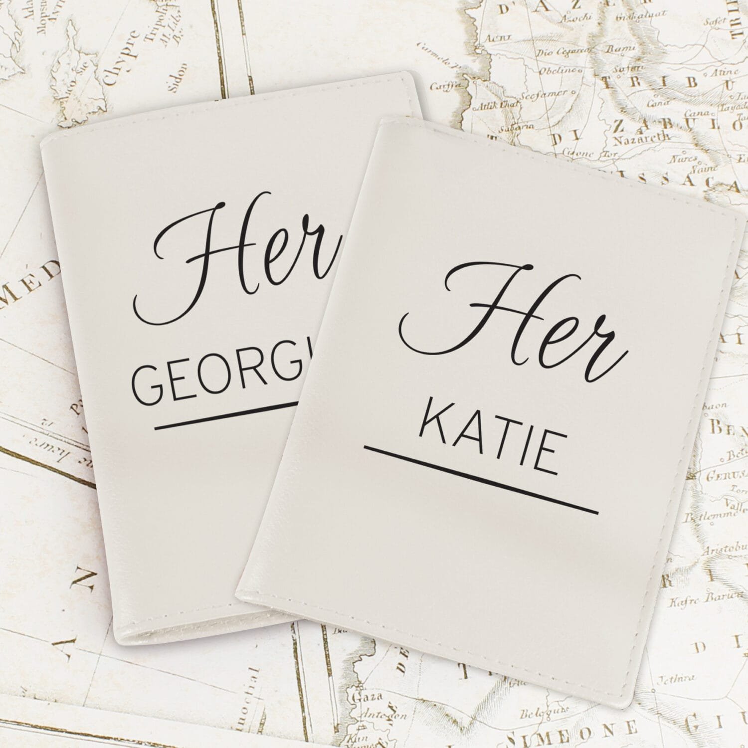 Line 2 (Surname): Automatically formatted in UPPERCASE for a bold finish. - Set Includes Two Holders: Supplied as a pair of cream passport holders, perfect for couples travelling together.