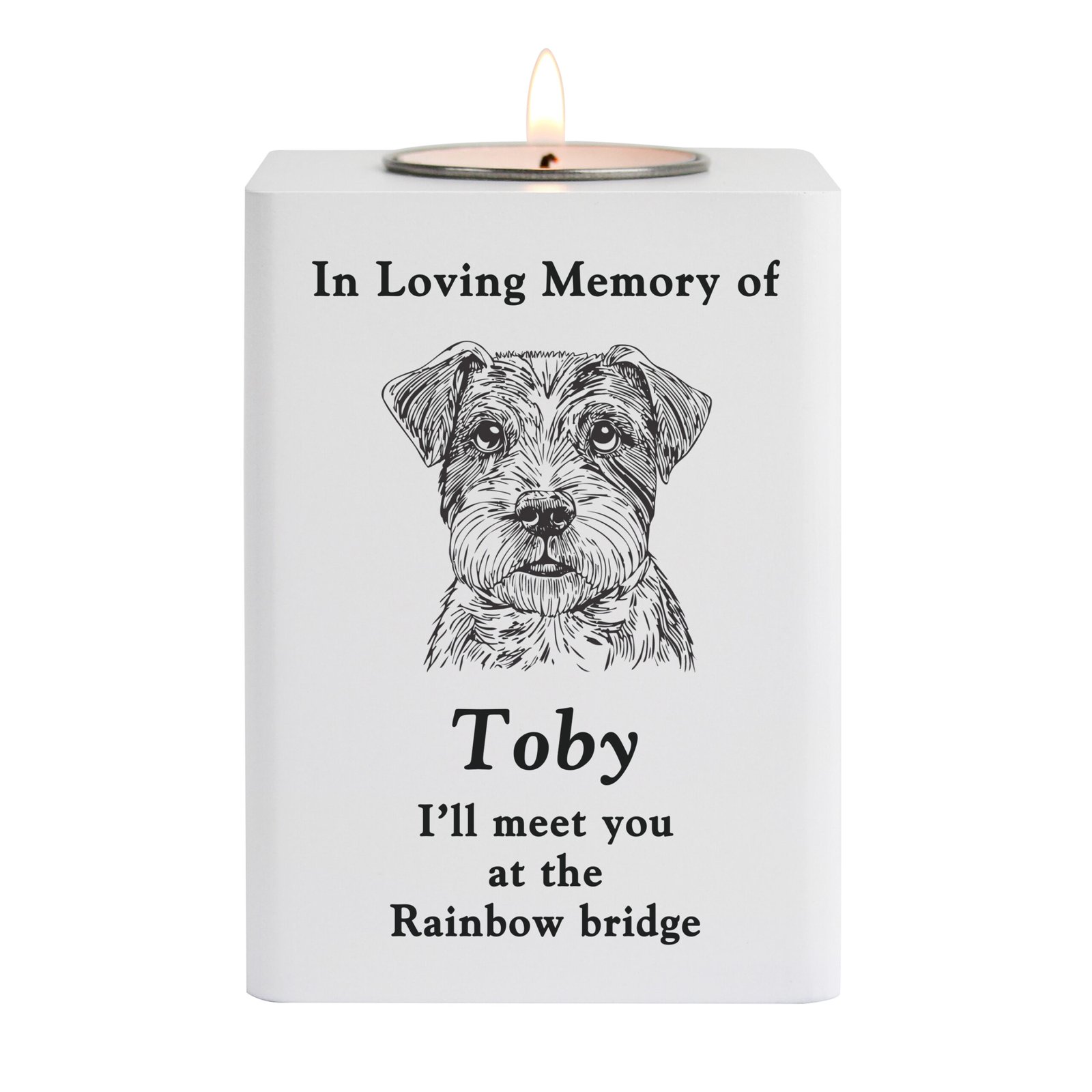 Honour the cherished memory of your beloved canine companion with our Personalised Dog Breed Memorial Tea Light Holder. Thoughtfully crafted from painted wood, this elegant memorial piece provides a peaceful way to remember a much-loved pet.
