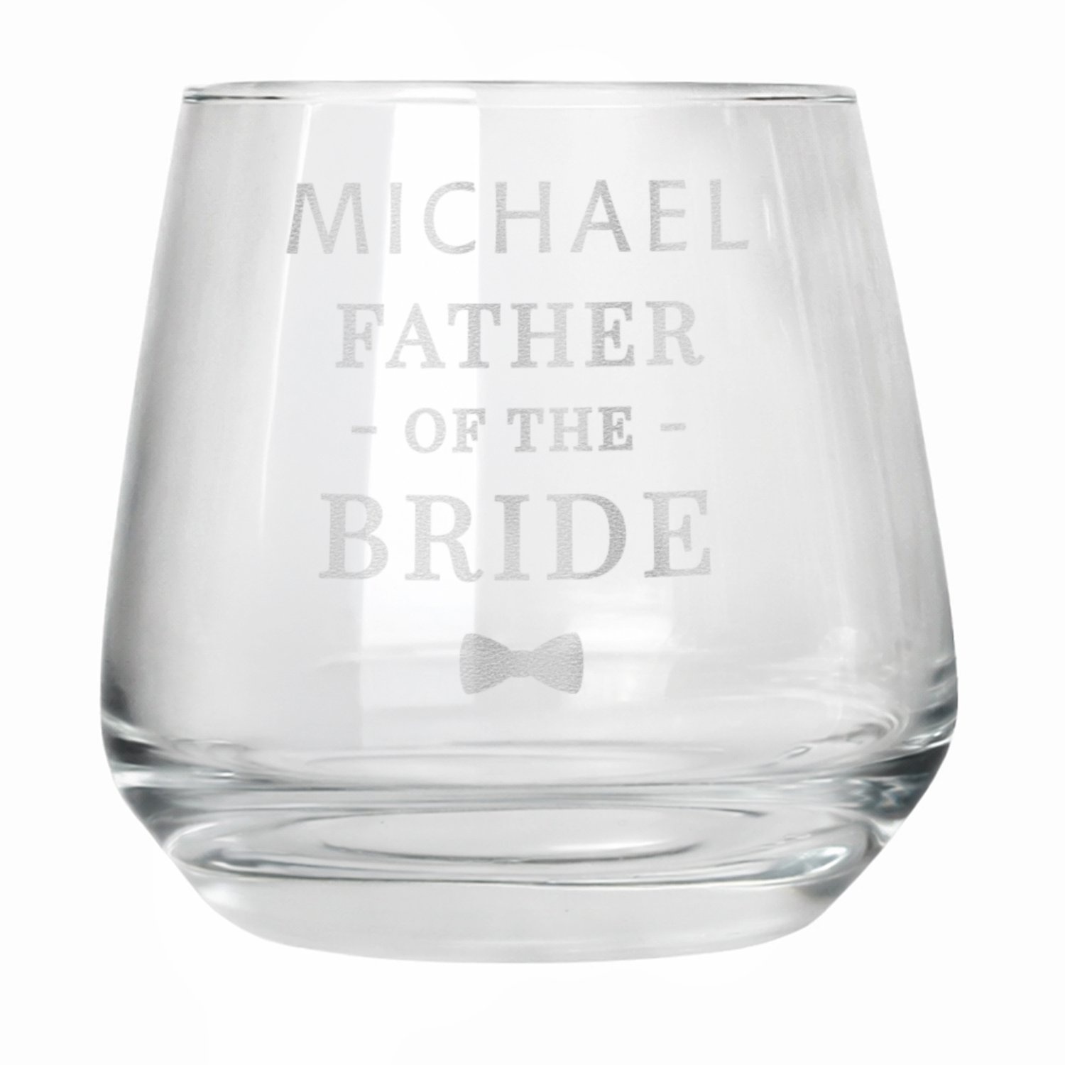 Celebrate in style with this Personalised ‘Father of the Bride’ Bow Tie Motif Glass Tumbler – the perfect keepsake for weddings and stag celebrations. Featuring a sophisticated bow tie design alongside the fixed text “Father of the Bride”, this whisky glass makes a thoughtful gift and a lasting reminder of the special day. Personalise it with a name for a truly unique touch.