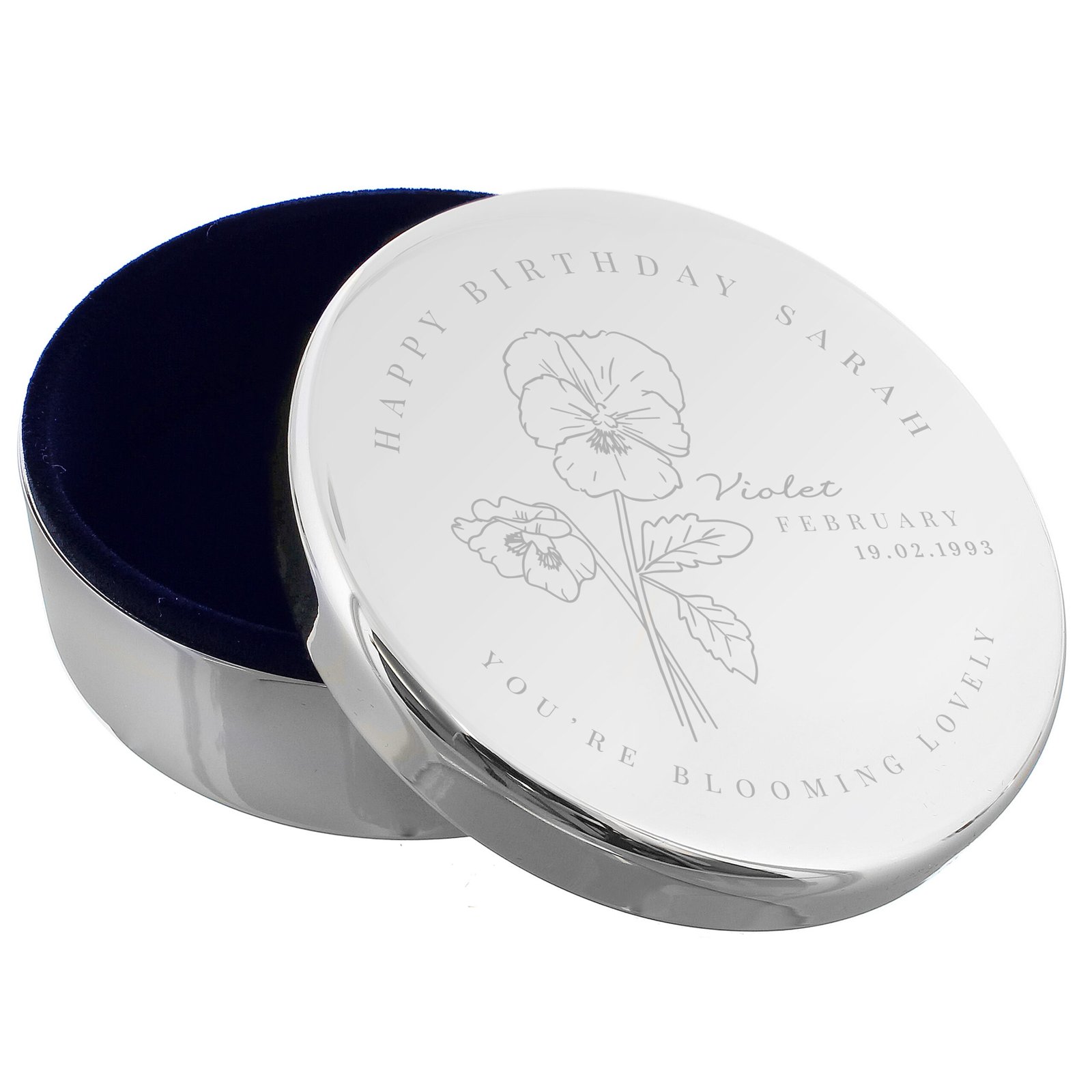 Personalised February Birth Flower Design Round Silver Nickel Plated Trinket Box
