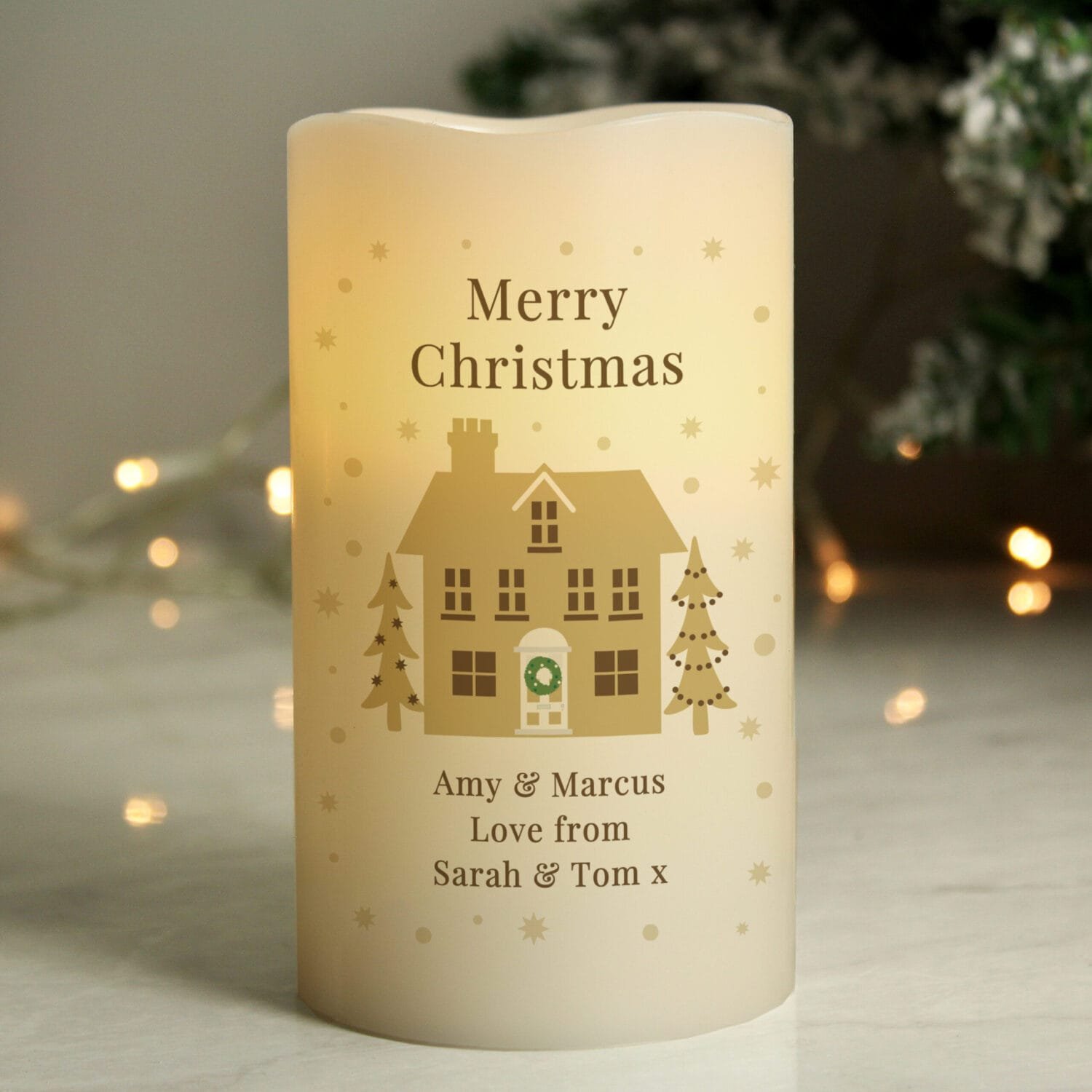Create a cosy, magical atmosphere this holiday season with the Personalised Festive Christmas Village Design LED Pillar Candle. Featuring a charming gold Christmas village scene, this candle is perfect for adding a warm glow to your home décor — and with custom text, it’s a keepsake to treasure year after year.