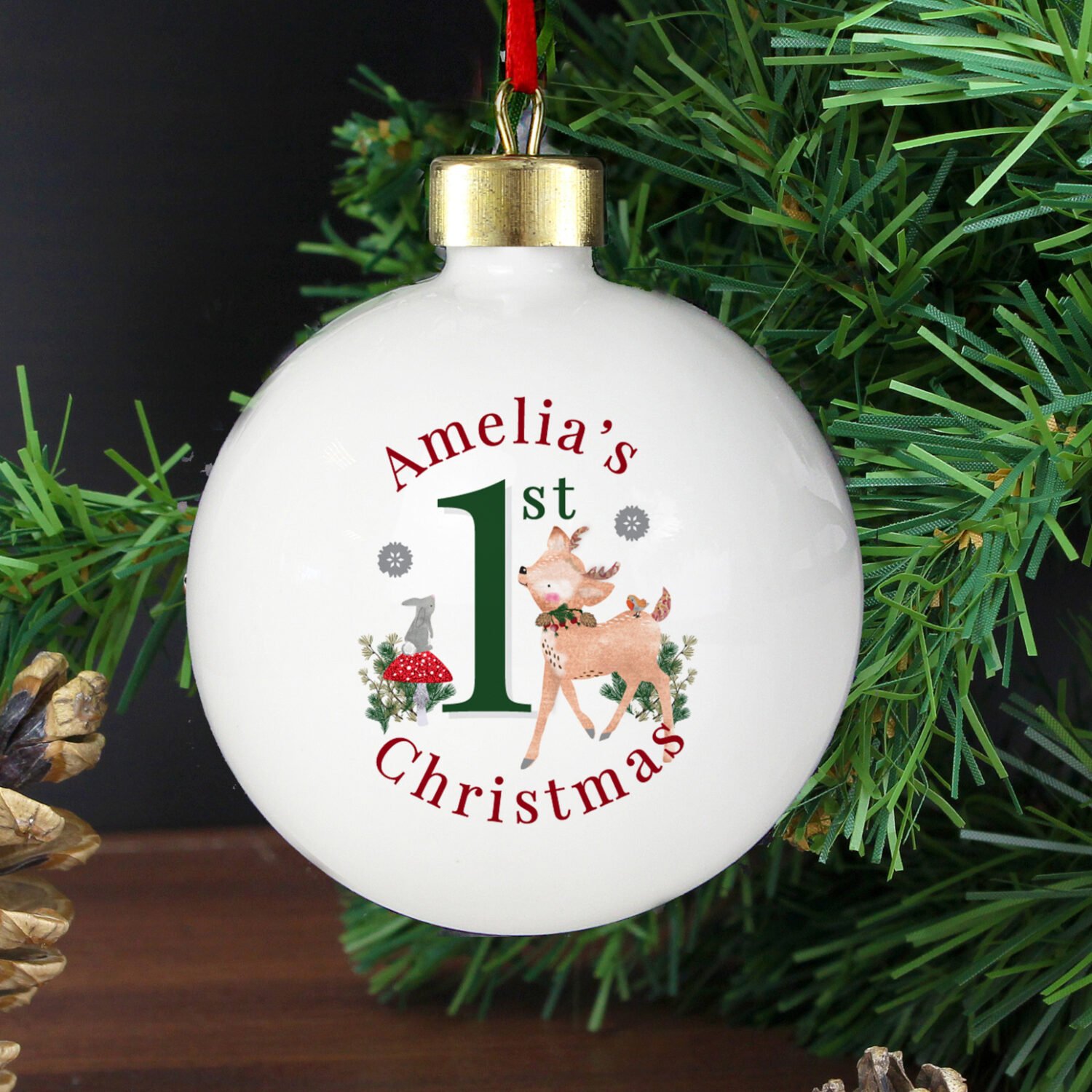 Personalised Festive Fawn Design ‘1st Christmas’ Ceramic Bauble