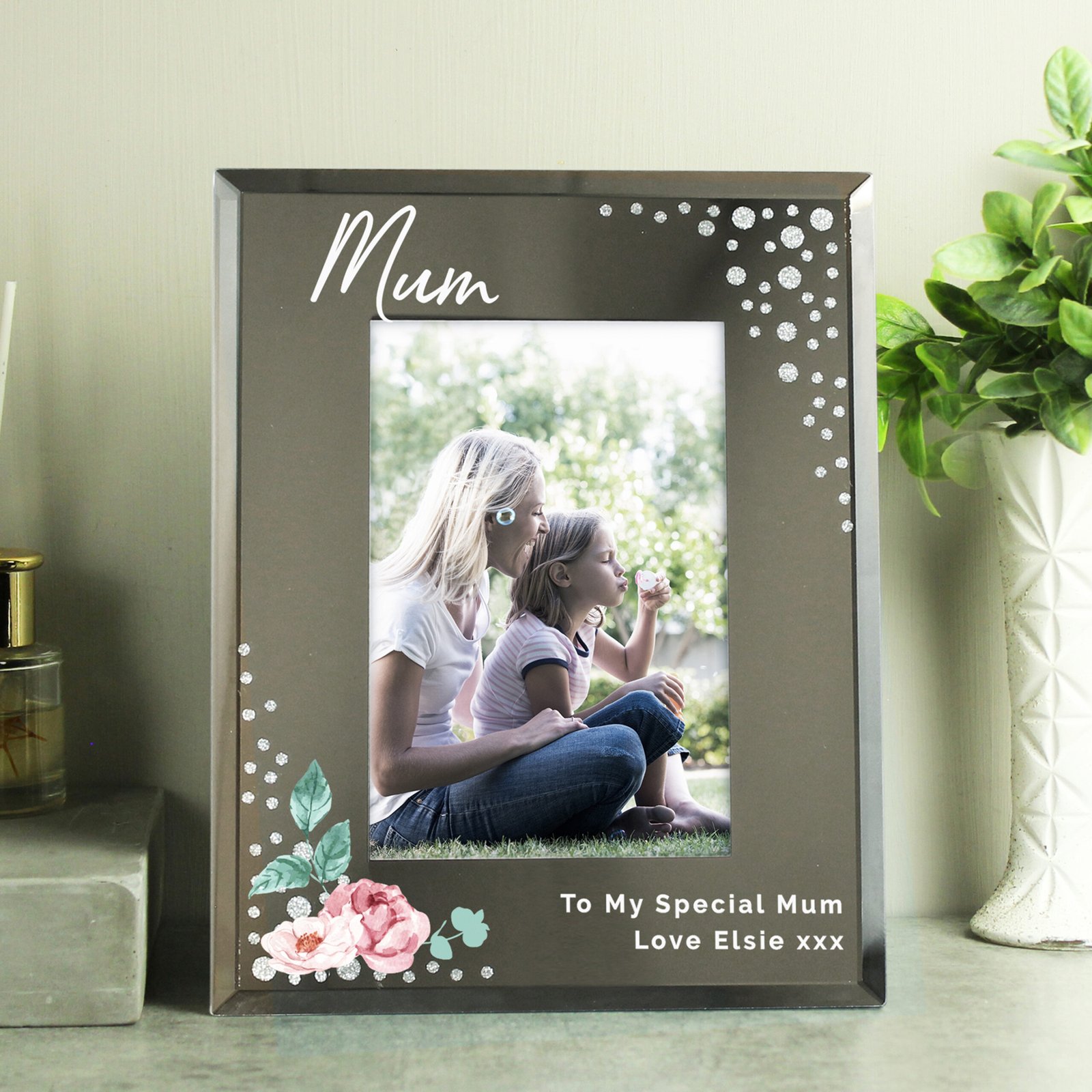 Personalised Floral Design Diamante 4×6 Portrait Mirrored Glass Photo Frame