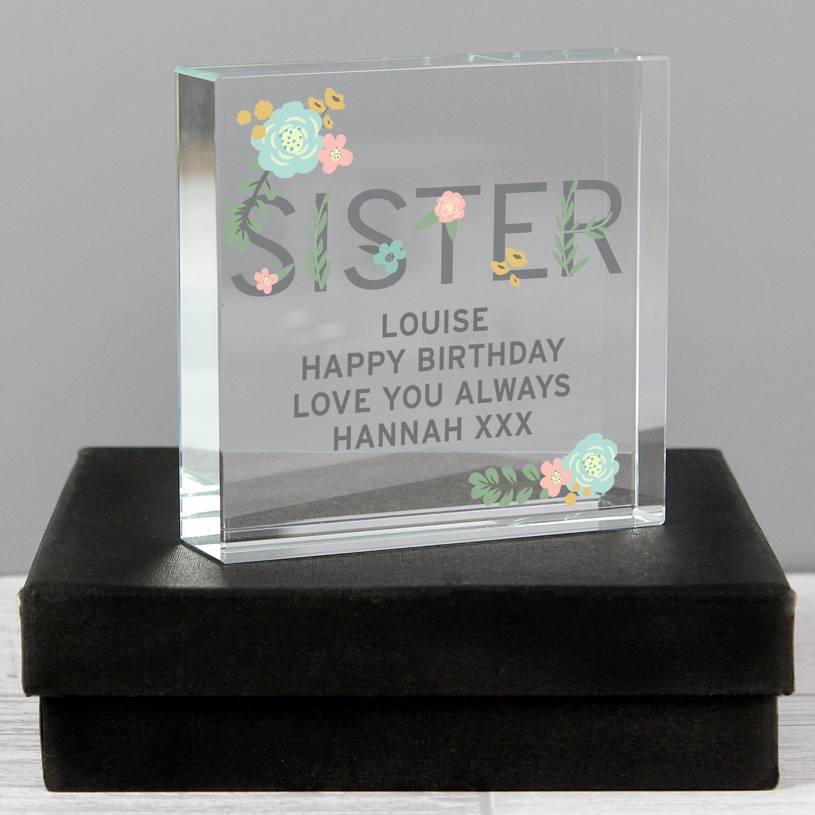 Celebrate the unbreakable bond between sisters with this elegant Personalised Floral Design ‘Sister’ Crystal Glass Token. With its delicate floral artwork and beautifully engraved message, this modern keepsake makes a heartfelt gift for any occasion—from birthdays to Mother’s Day, or simply to say “thank you.”