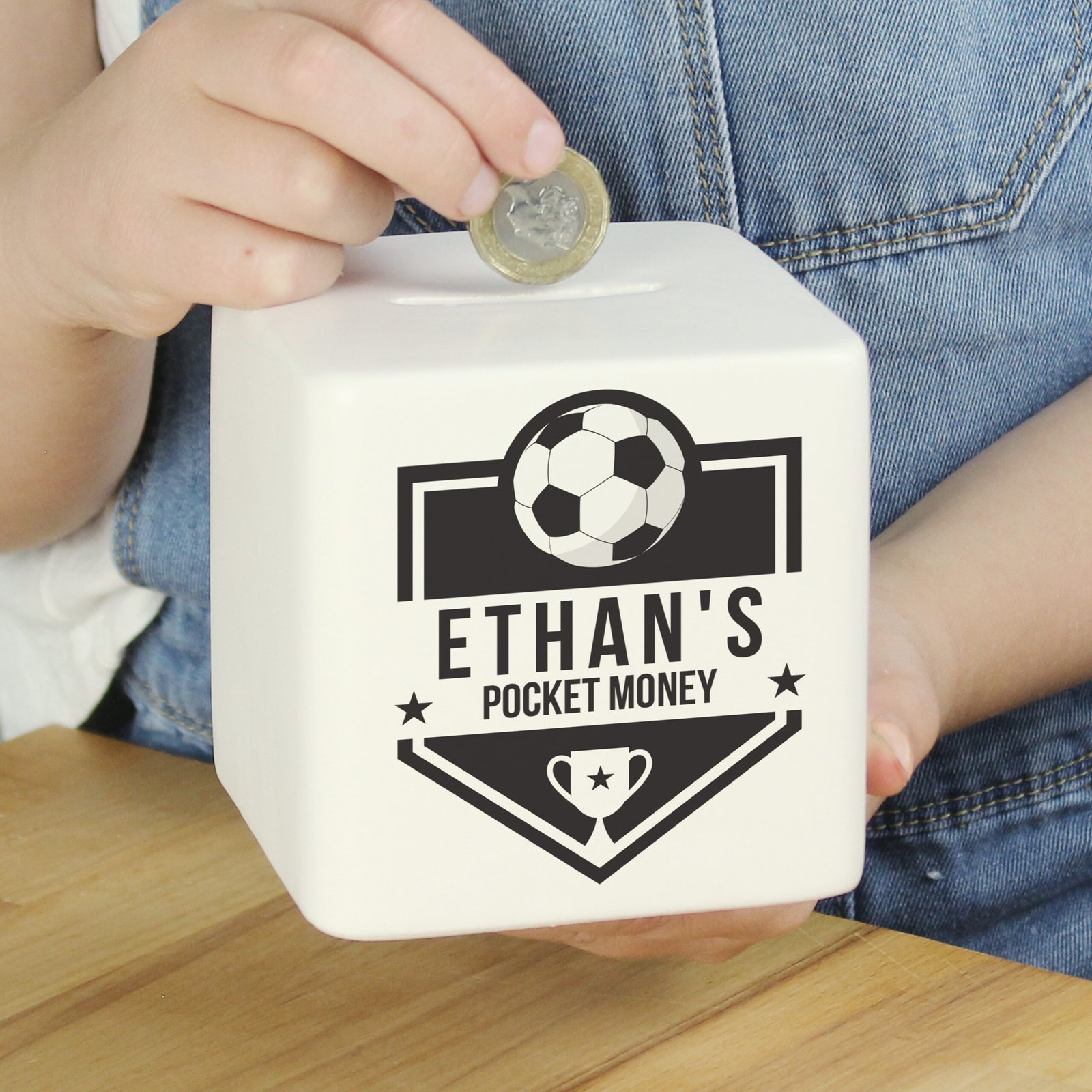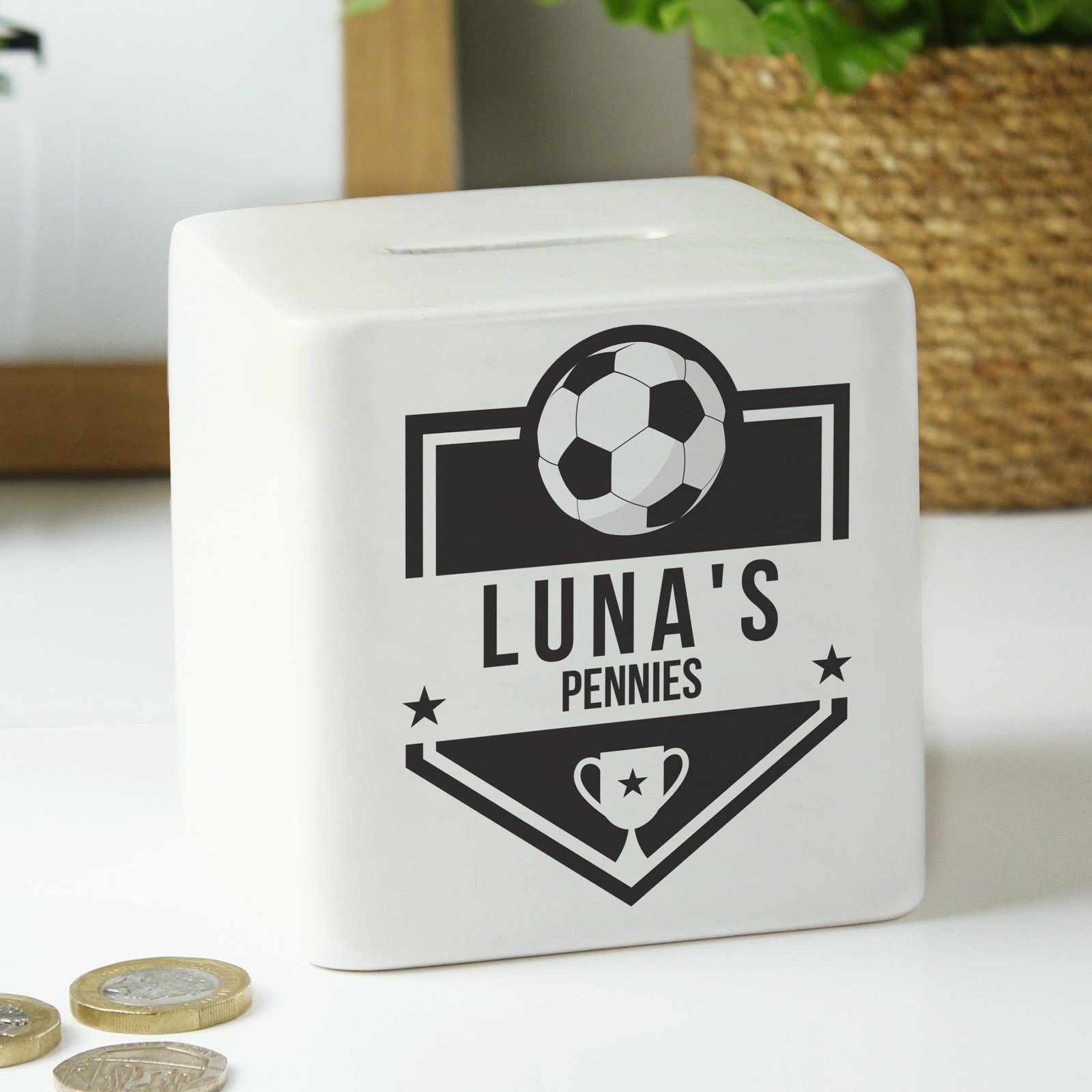 Score big on savings with this Personalised Football Badge Design Ceramic Square Money Box – the perfect keepsake for football fans of all ages. Practical and stylish, it’s an ideal way to save for match tickets, team merch, or that next big goal.