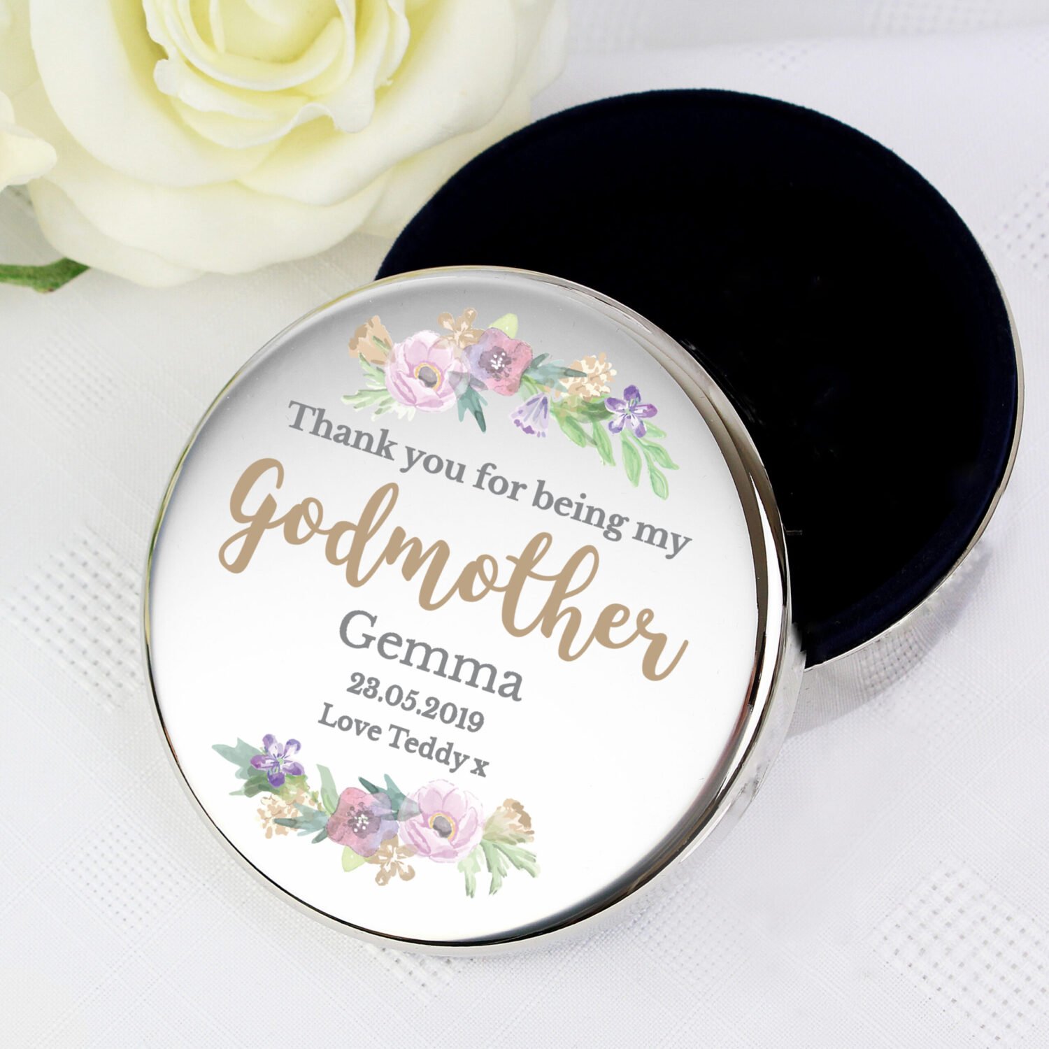 Personalised ‘Godmother’ Floral Watercolour Design Round Silver Nickel Plated Trinket Box