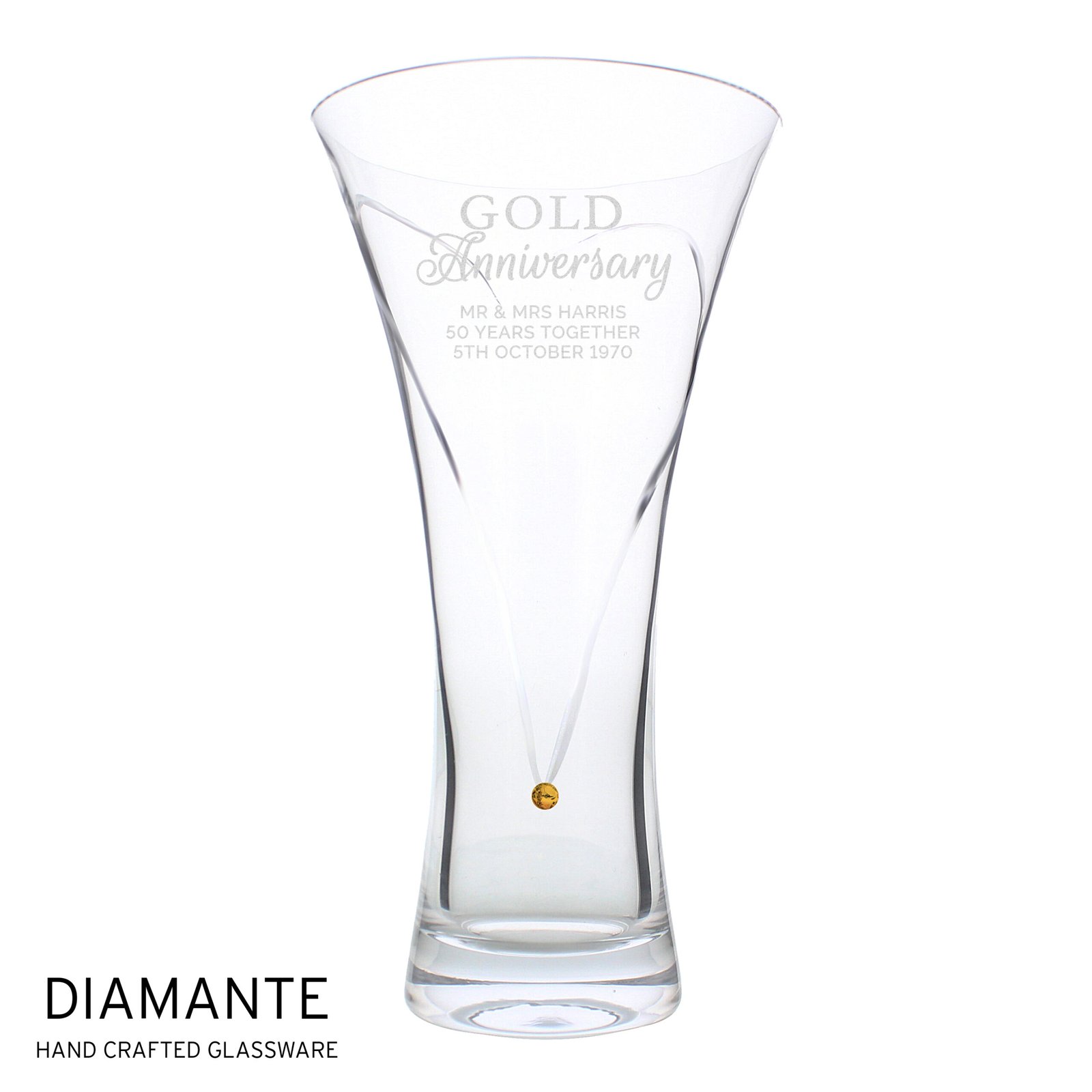 Celebrate a milestone in style with this elegant Personalised ‘Gold Anniversary’ Hand Cut Diamante Heart Glass Vase. Crafted with care and finished with sparkling diamante detailing, this beautiful vase makes a timeless keepsake gift for a very special occasion.