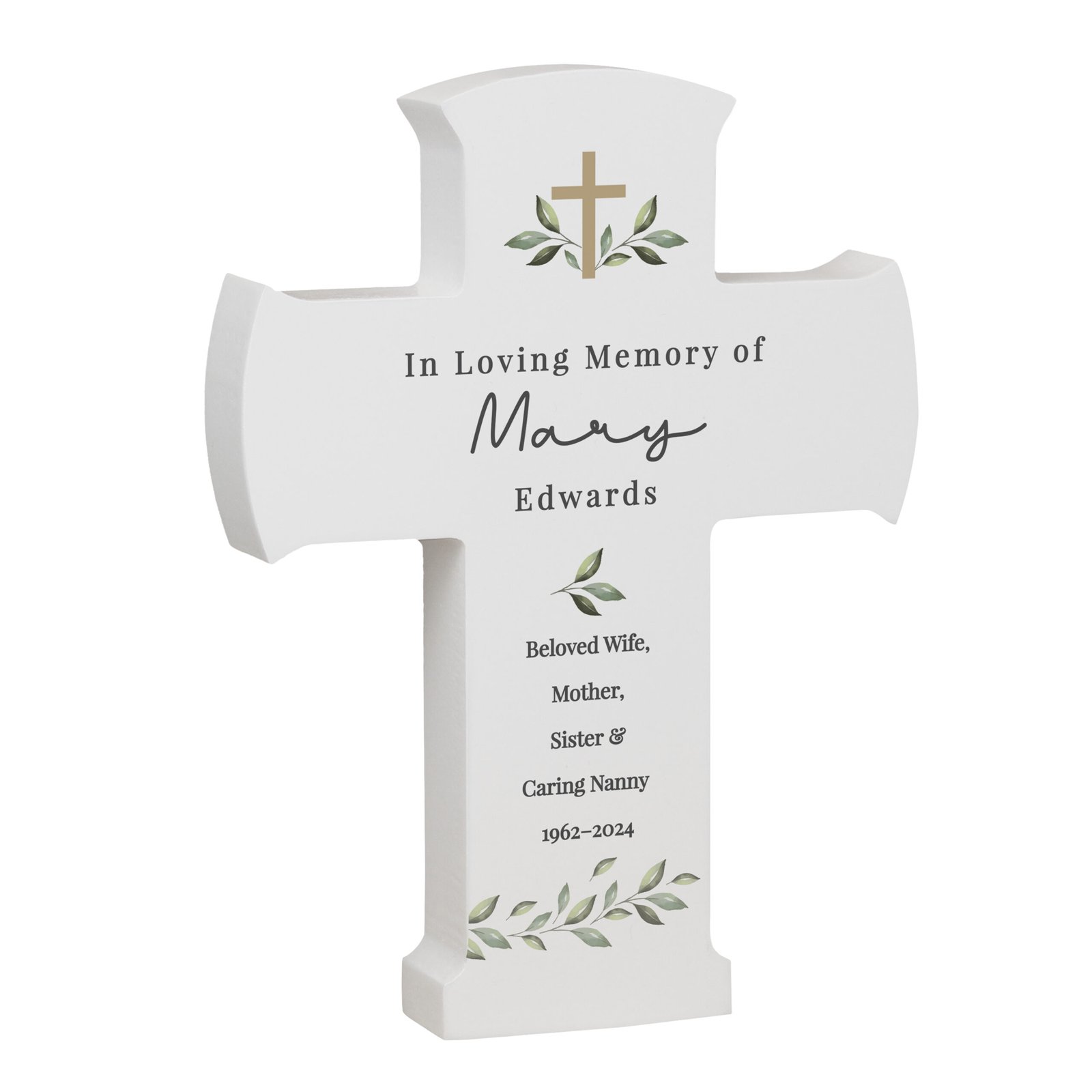 Crafted from high-quality wood, this elegant ornament features a delicate botanical design and a striking gold cross motif, blending natural charm with spiritual grace. Perfect for displaying in the home, nursery, or memorial space, it serves as a beautiful reminder of the special people and moments that touch our hearts.