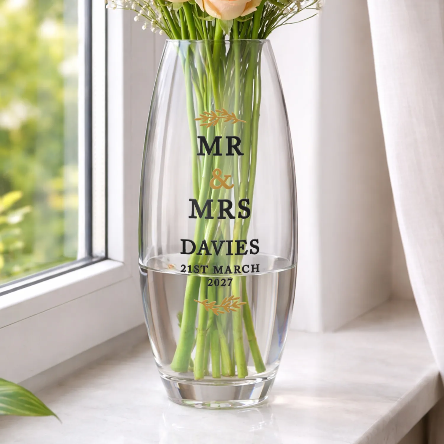 Make any couple’s celebration truly memorable with this Personalised Gold Leaf Couples Tapered Glass Bullet Vase—a stylish, romantic, and meaningful keepsake.