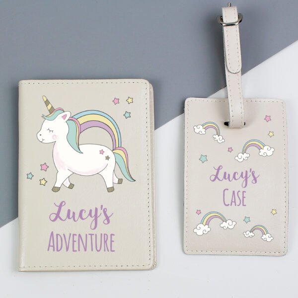 Personalised Baby Unicorn Design Cream Leather Passport Holder & Luggage Tag Set