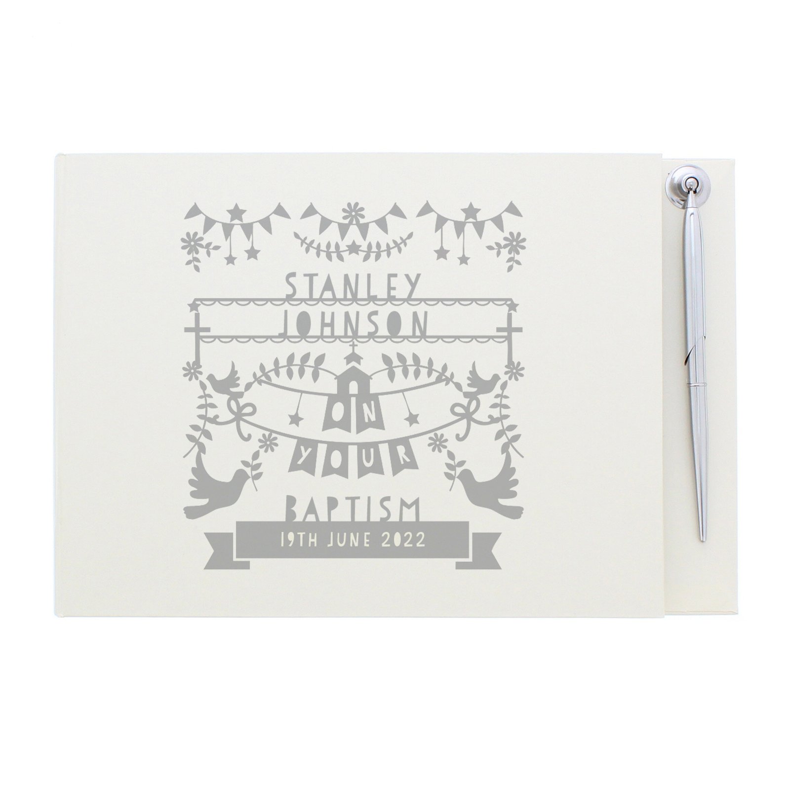 Capture memories, messages, and well wishes with this elegant Grey Papercut Guest Book & Pen Set. Perfect for religious occasions and special celebrations, it makes a beautiful keepsake to treasure for years.