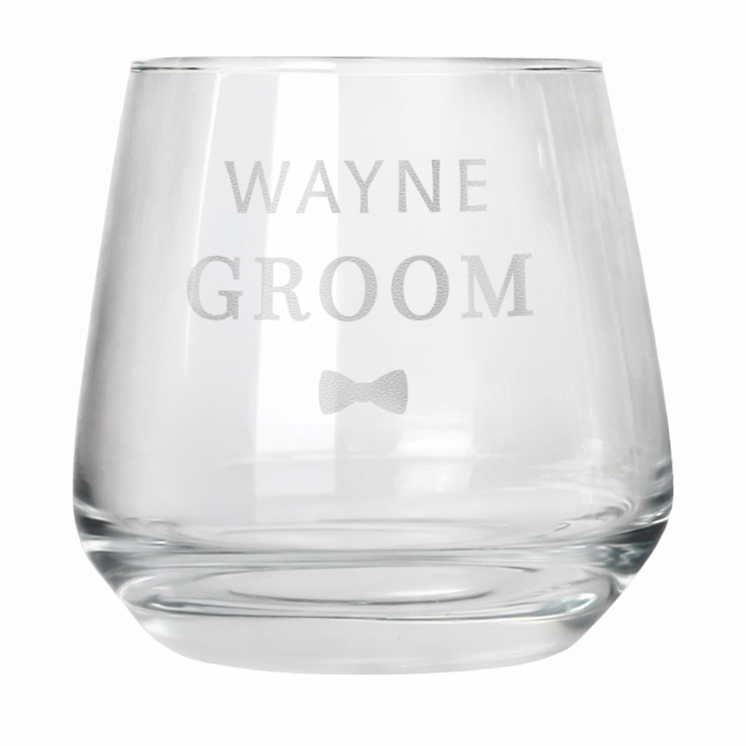Raise a toast to the big day with this Personalised ‘Groom’ Bow Tie Motif Glass Tumbler – a stylish and thoughtful keepsake for weddings and stag celebrations. Featuring a classic bow tie design alongside the fixed text “Groom”, this whisky glass is the perfect way to mark the occasion.