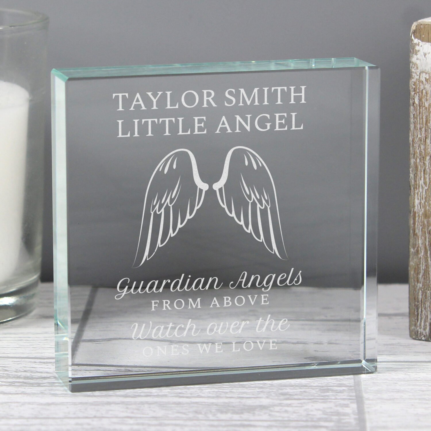 Personalised ‘Guardian Angels From Above’ Angel Wings Design Memorial Crystal Glass Token