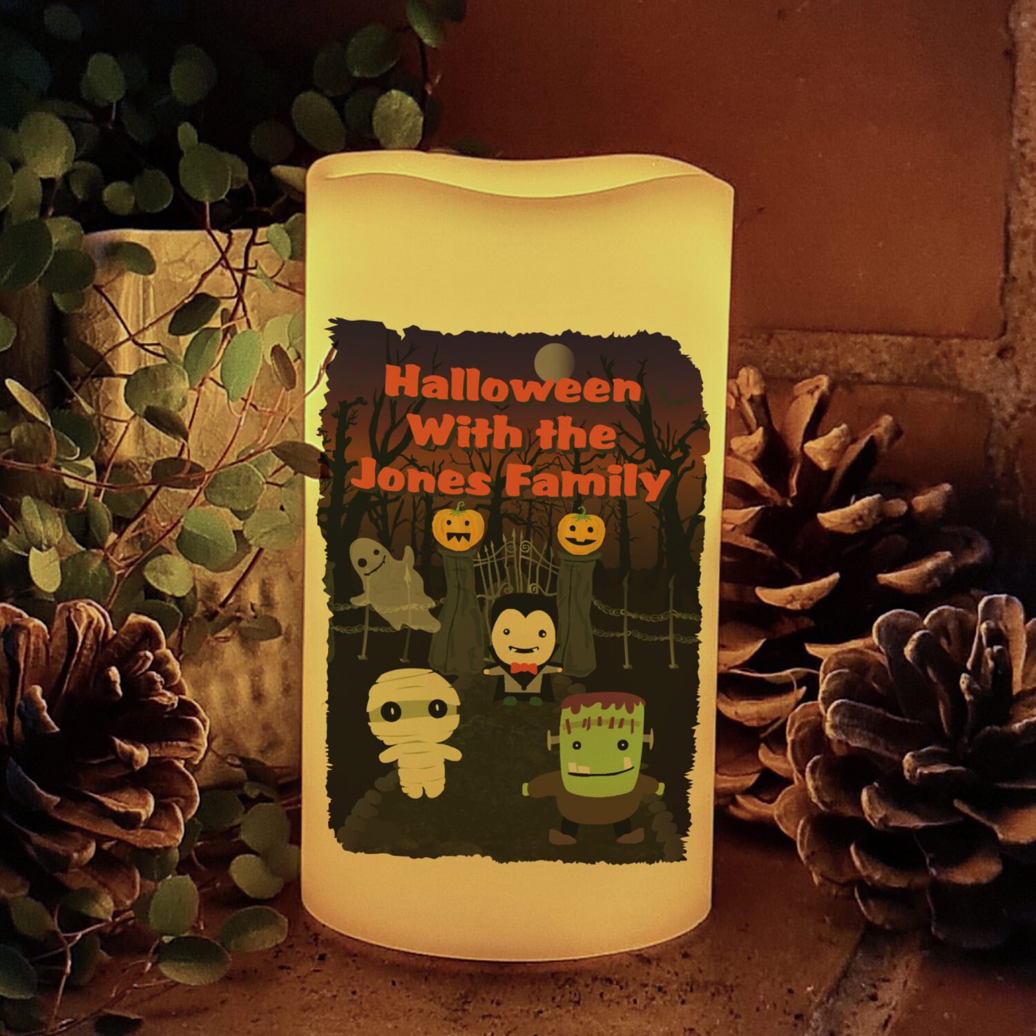 A safe and spooky way to light up the night, this personalised LED candle brings Halloween charm to any setting—without the mess or danger of an open flame!