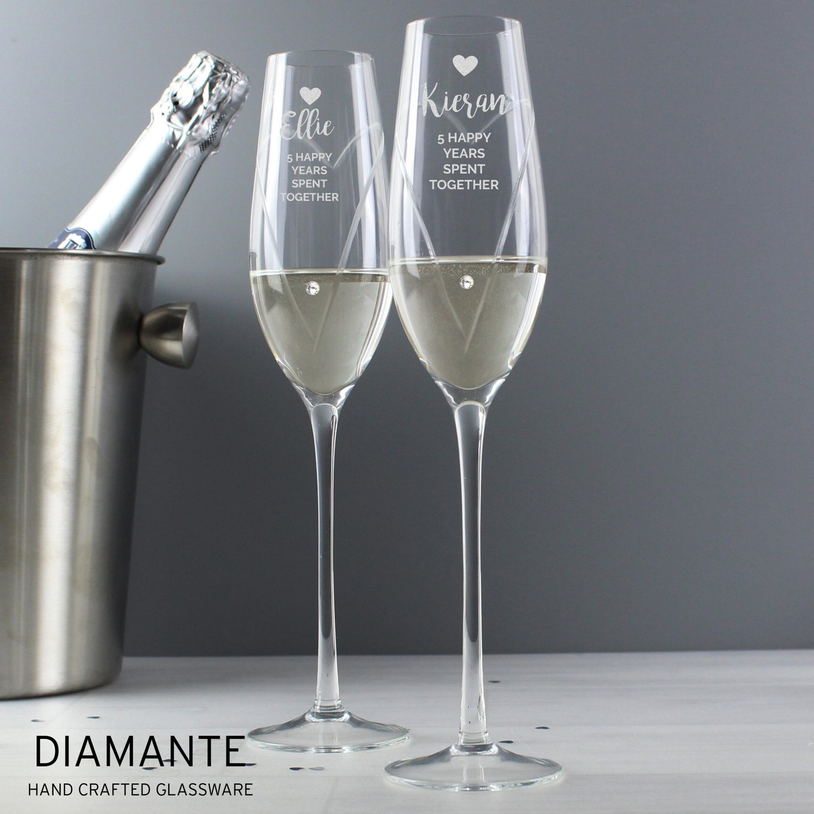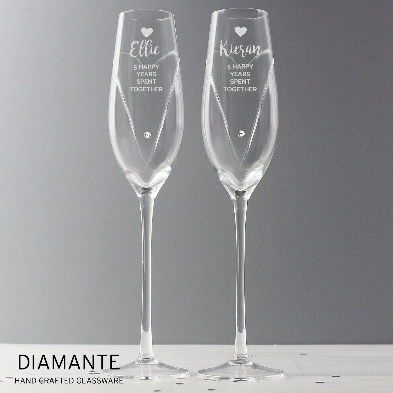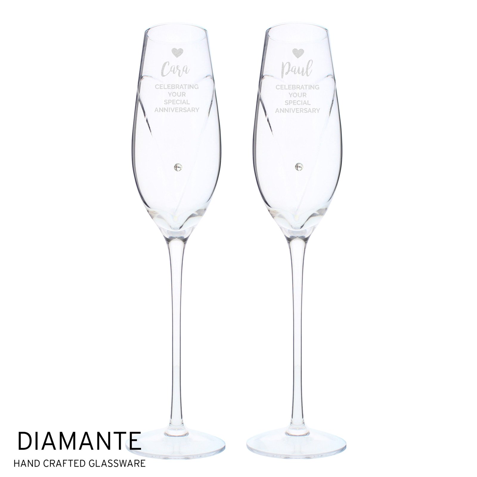 Personalised Hand Cut Heart Celebration Pair of Glass Champagne Flutes + Gift Box
