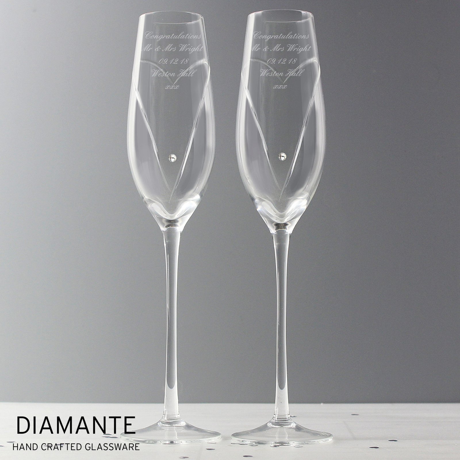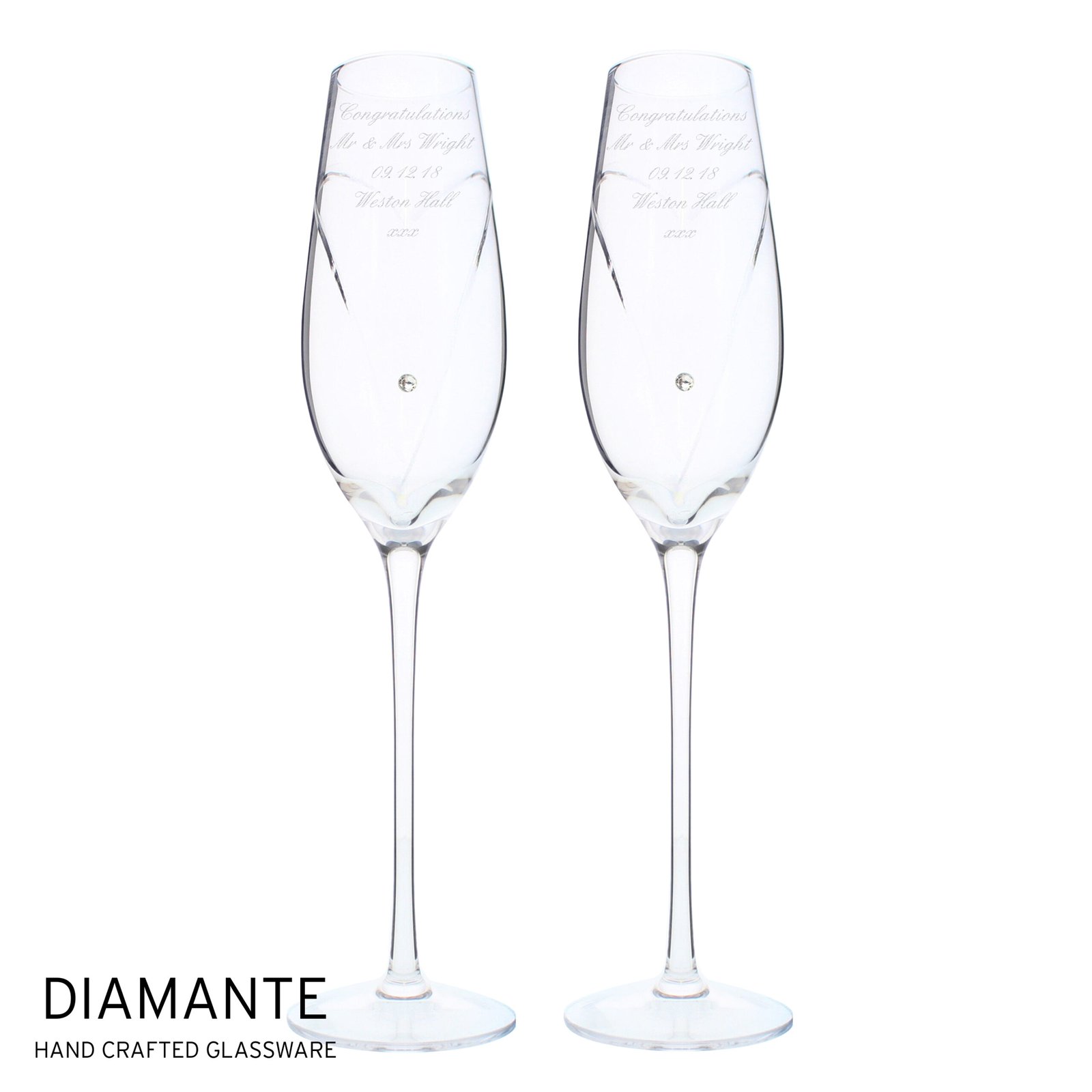 Personalised Hand Cut Heart Diamante Pair of Glass Champagne Flutes & Gift Box