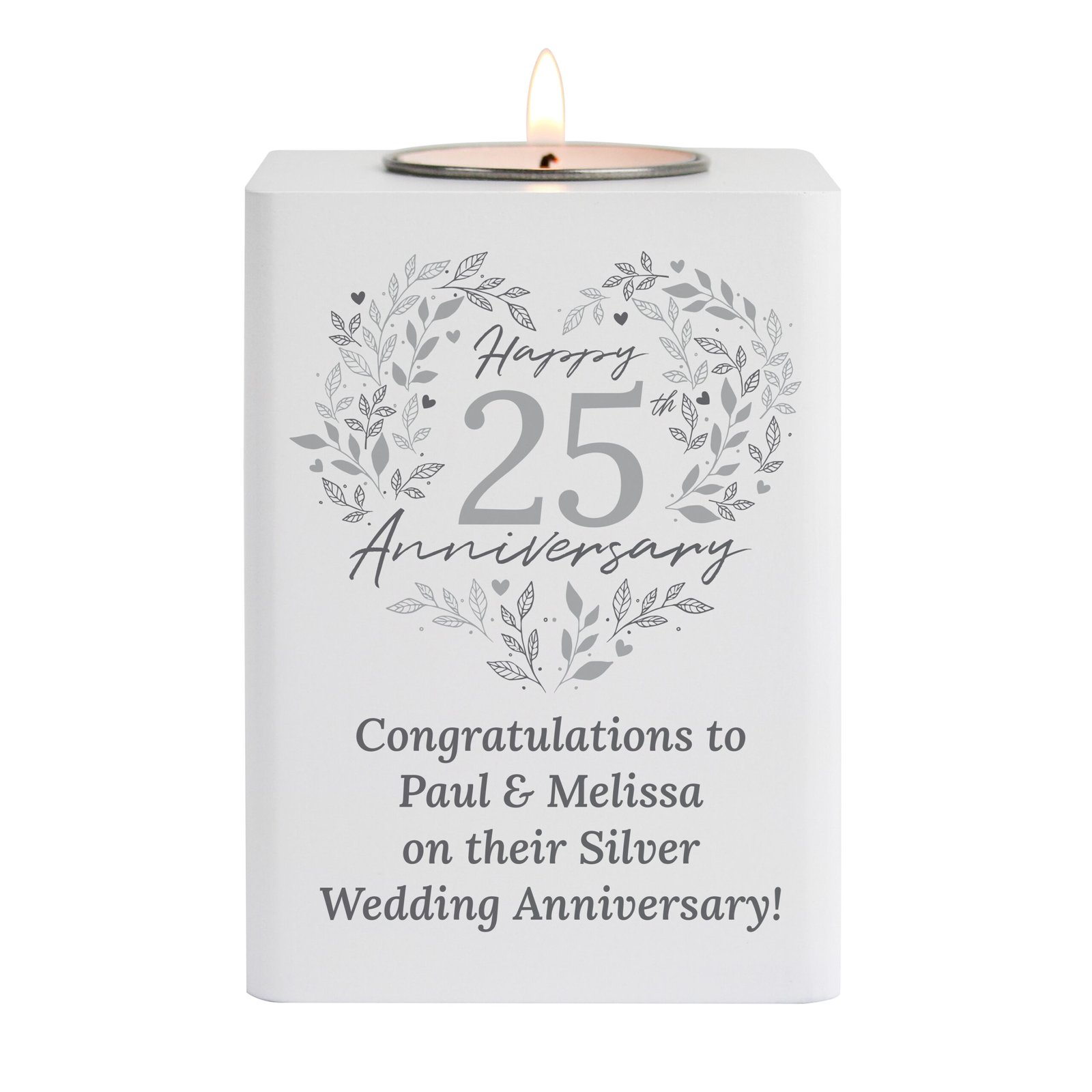 Personalised ‘Happy 25th Anniversary’ Silver Heart Design White Wooden Tea Light Candle Holder