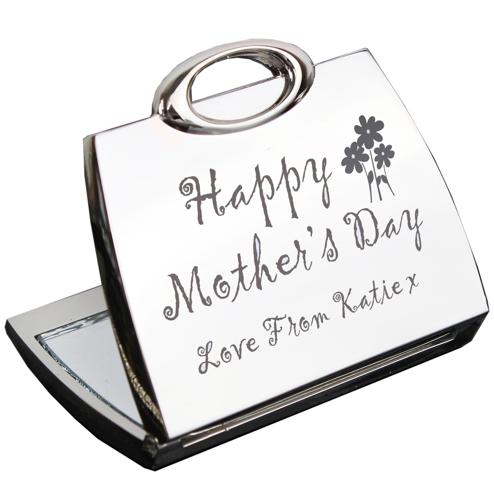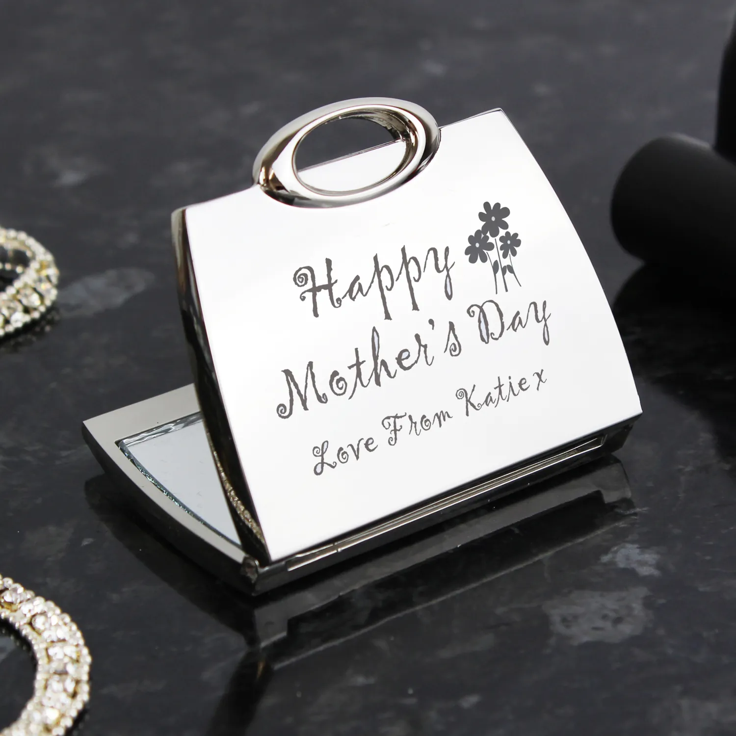 Personalised ‘Happy Mother’s Day’ Flower Motif Handbag Shaped Silver Nickel Plated Compact Mirror
