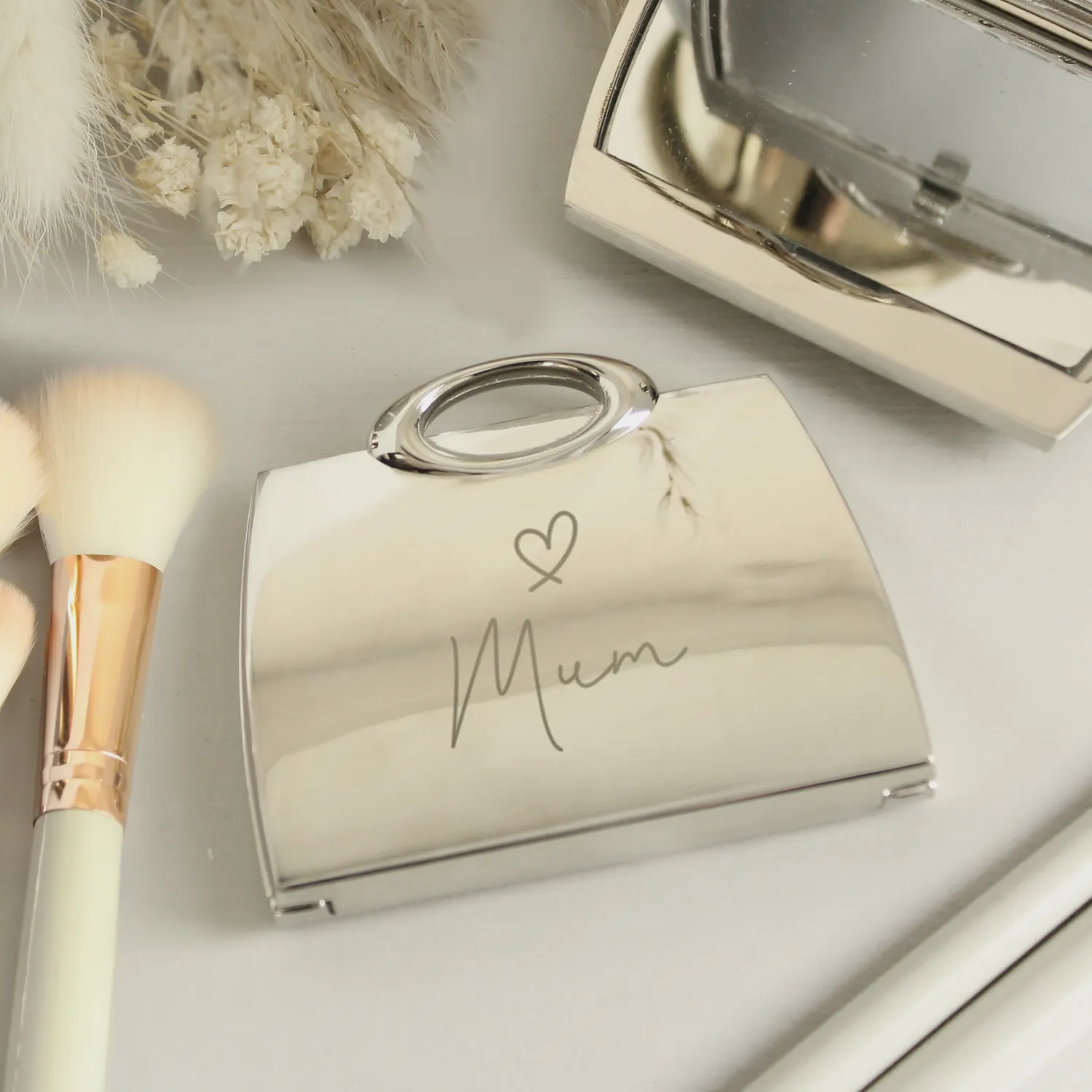 Stylish, elegant, and practical – this Personalised Handbag Shaped Compact Mirror is the perfect keepsake for her. Finished with a delicate heart motif, it’s a thoughtful accessory that fits effortlessly into any handbag.