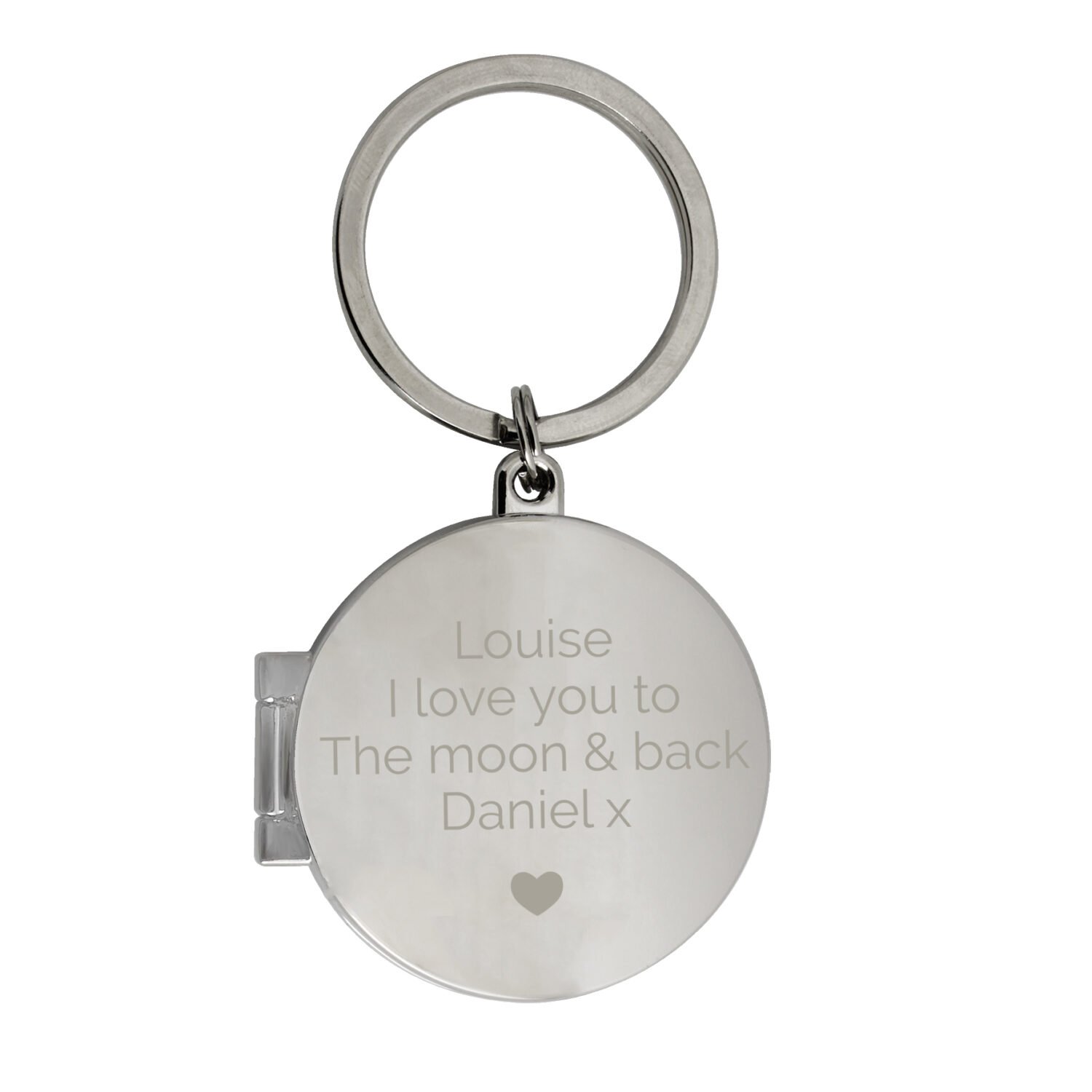 Keep cherished memories close with this elegant Personalised Heart Motif Silver Finish Round Photo Keyring. A heartfelt and practical gift for any occasion, it’s perfect for displaying treasured photos while carrying a personalised message.