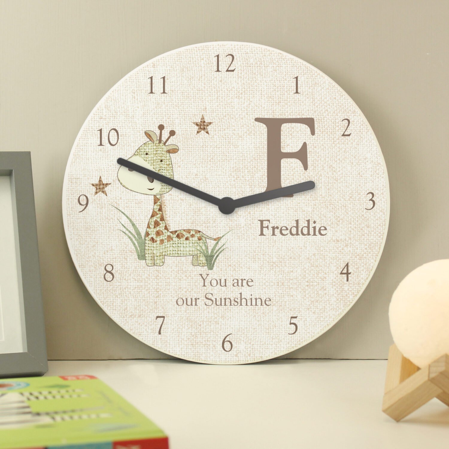 Create a warm and welcoming space for a little one with this personalised giraffe wall clock — a delightful mix of sentiment and style.