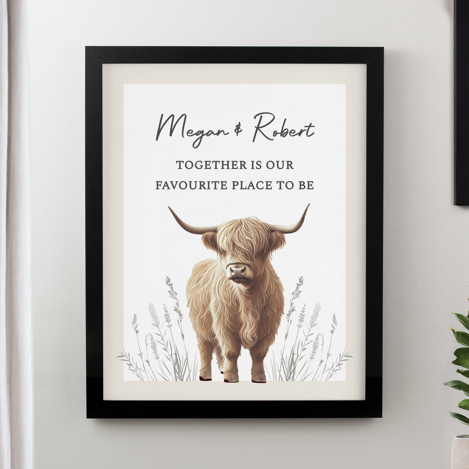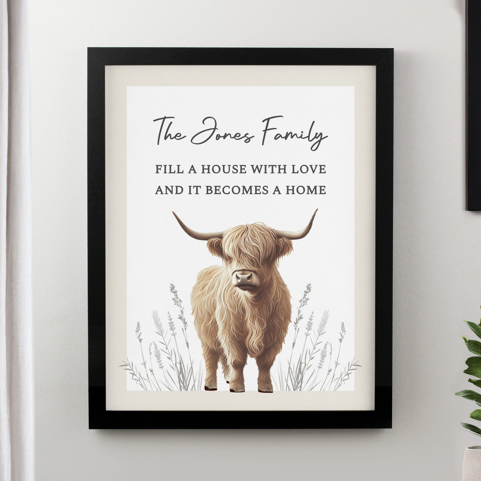 Bring rustic charm and personality into your space with this Personalised Highland Cow Black Framed Poster. With a beautifully illustrated Highland cow as the focal point, this framed print adds warmth and character to any room — whether it’s a cosy cottage, modern home, or country-inspired office.