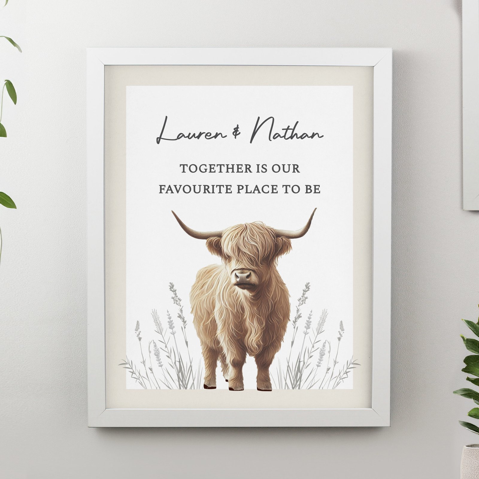 Bring rustic charm and personality into your space with this Personalised Highland Cow White Framed Poster. With a beautifully illustrated Highland cow as the focal point, this framed print adds warmth and character to any room — whether it’s a cosy cottage, modern home, or country-inspired office.