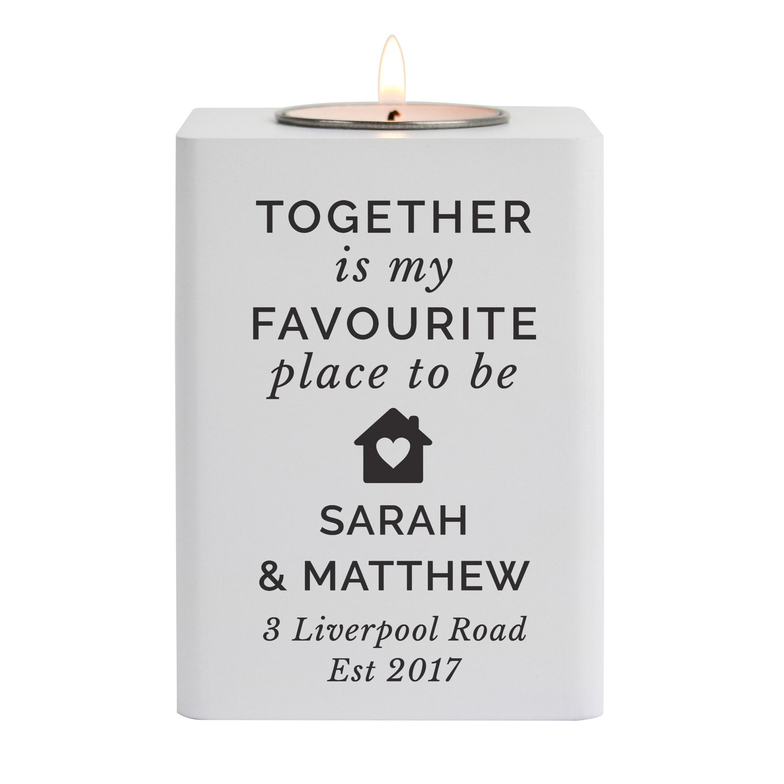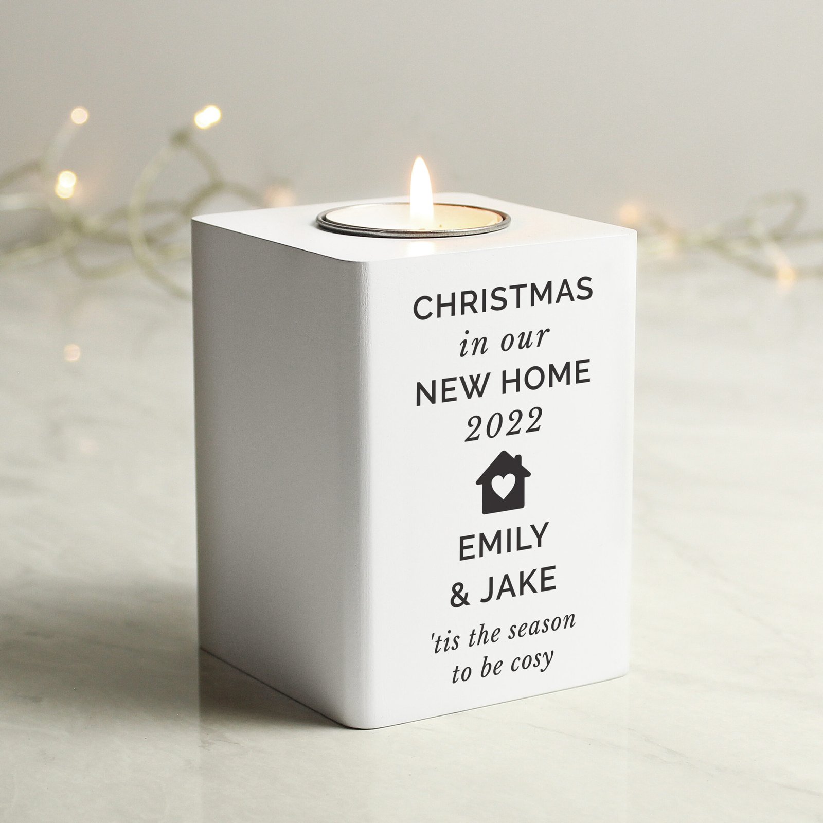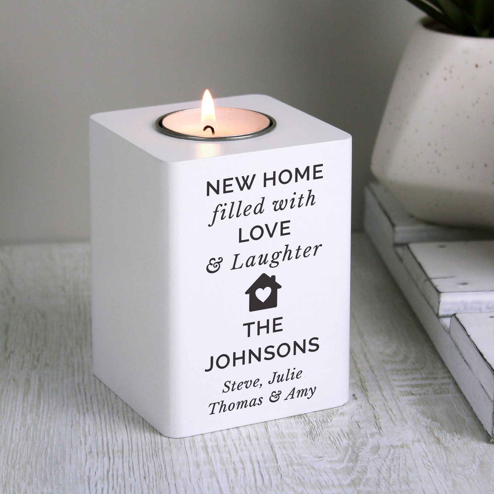 Personalised House & Heart Motif White Wooden Tea Light Candle Holder