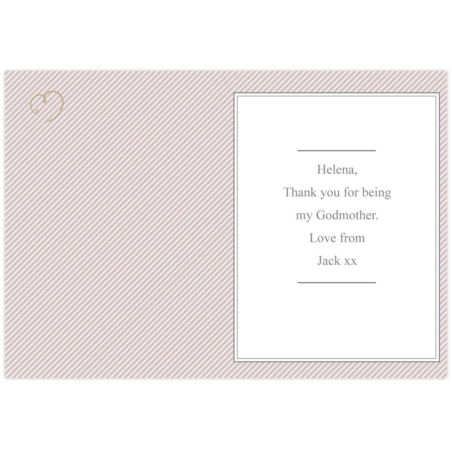 Show your Godmother just how much she means to you with this thoughtful and personalised greeting card. Perfect for Baptisms, Christenings, or simply as a heartfelt thank-you, this card is a keepsake she’ll treasure forever.